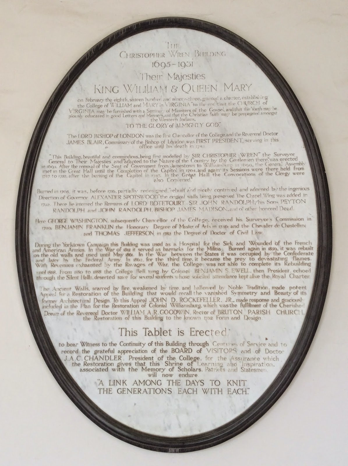 The center of the University is arranged around a grand rectangular Lawn, where the festivities are winding down, with the Rotunda Building at the head. It’s a very handsome building, modeled after the Pantheon and exactly half its height and width, where Jefferson much more successfully married the local red brick look with classical design than at Monticello. Jefferson not only designed the Rotunda (with help), he designed the Academical Village, many of the other buildings, the overall layout, even, as I discover on a plaque on one of them, the whimsical wavy garden walls.