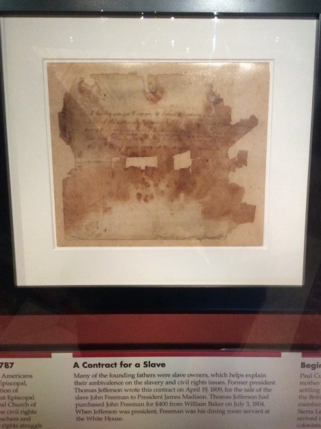 In the course of the day, we visit the National Museum of American History of the Smithsonian, where I make sure to visit the American Presidency gallery. I find some Jefferson artifacts among the collection, including the original portable desk on which he wrote the Declaration of Independence (which I already know is here, having visited the Smithsonian some years before), and a great little snuffbox from the early 1800’s painted with Jefferson’s likeness, which I don’t remember from my earlier visit.