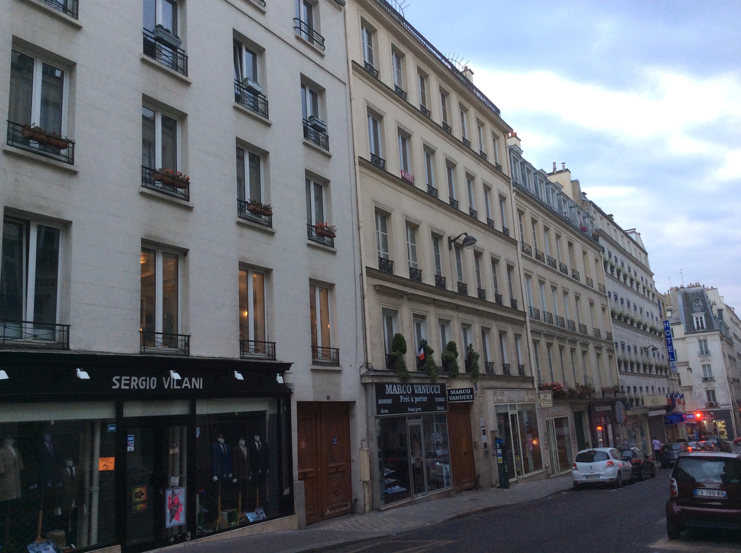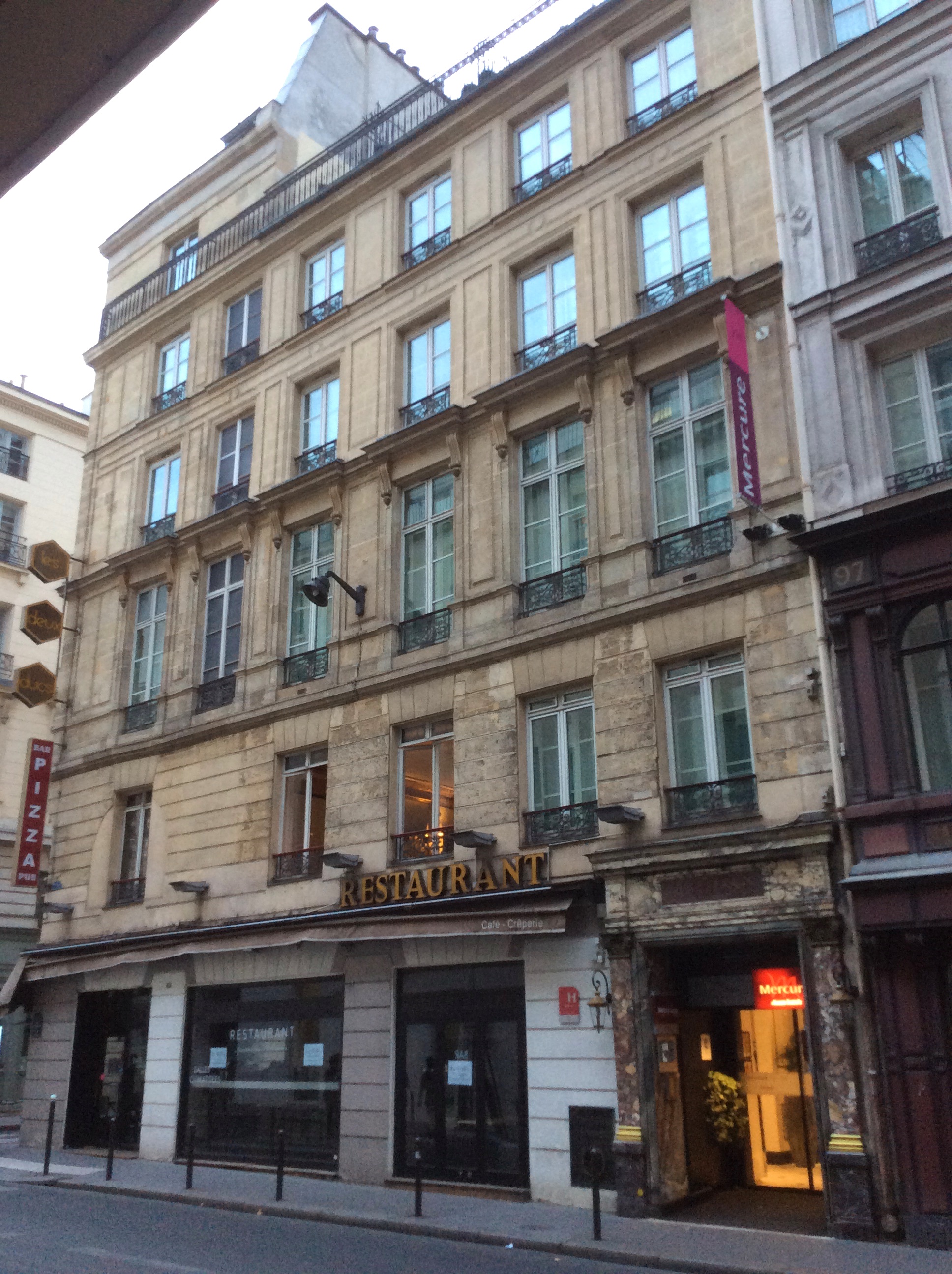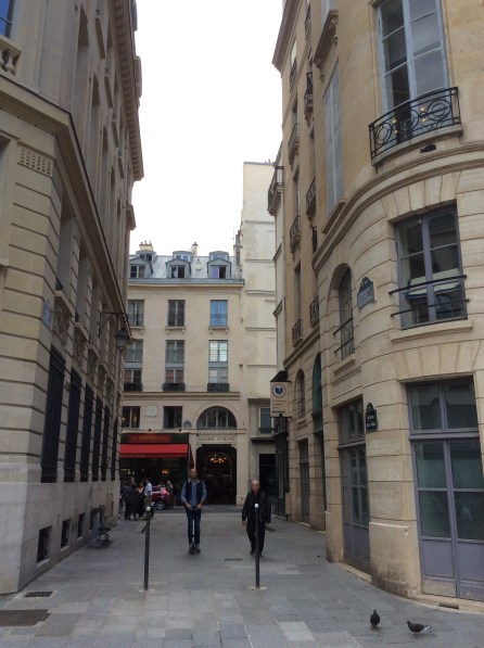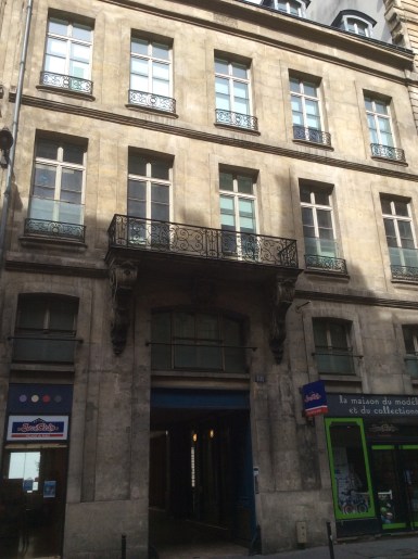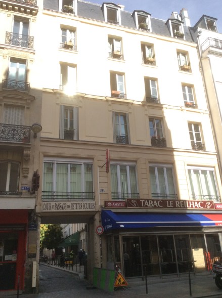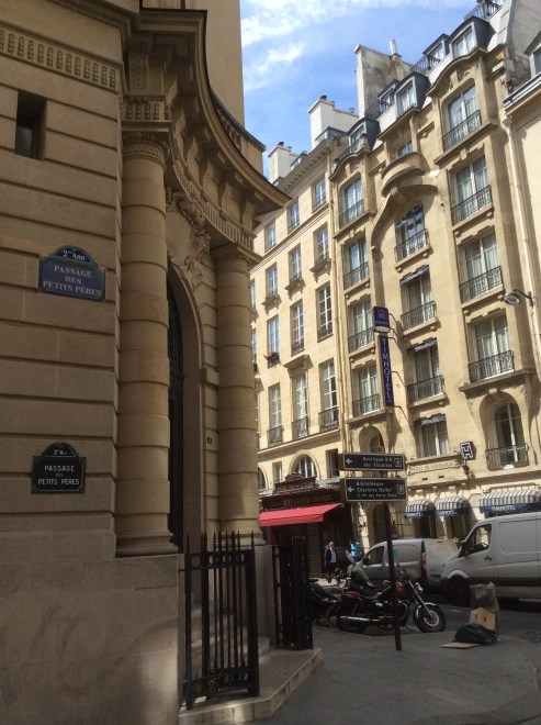 I return to my apartment to gather some things: I’ll be spending the night in Saint Quentin en Yvellines to greet my husband as he finishes his epic bike ride. Since it’s on my way back, I swing by the Passage des Petites Pères to see if there’s anything I missed when looking for White’s Hotel, the hangout for American expatriates that Wollstonecraft and Paine frequented and where Paine lived intermittently. It still seems likely that the building that houses the Galerie Vivienne is the former White’s Hotel, but Hotel de Normandie is a candidate as well, in its location on the left side of the Passage where the odd numbers are assigned.