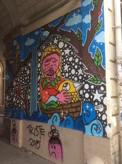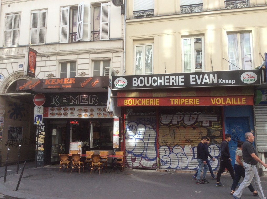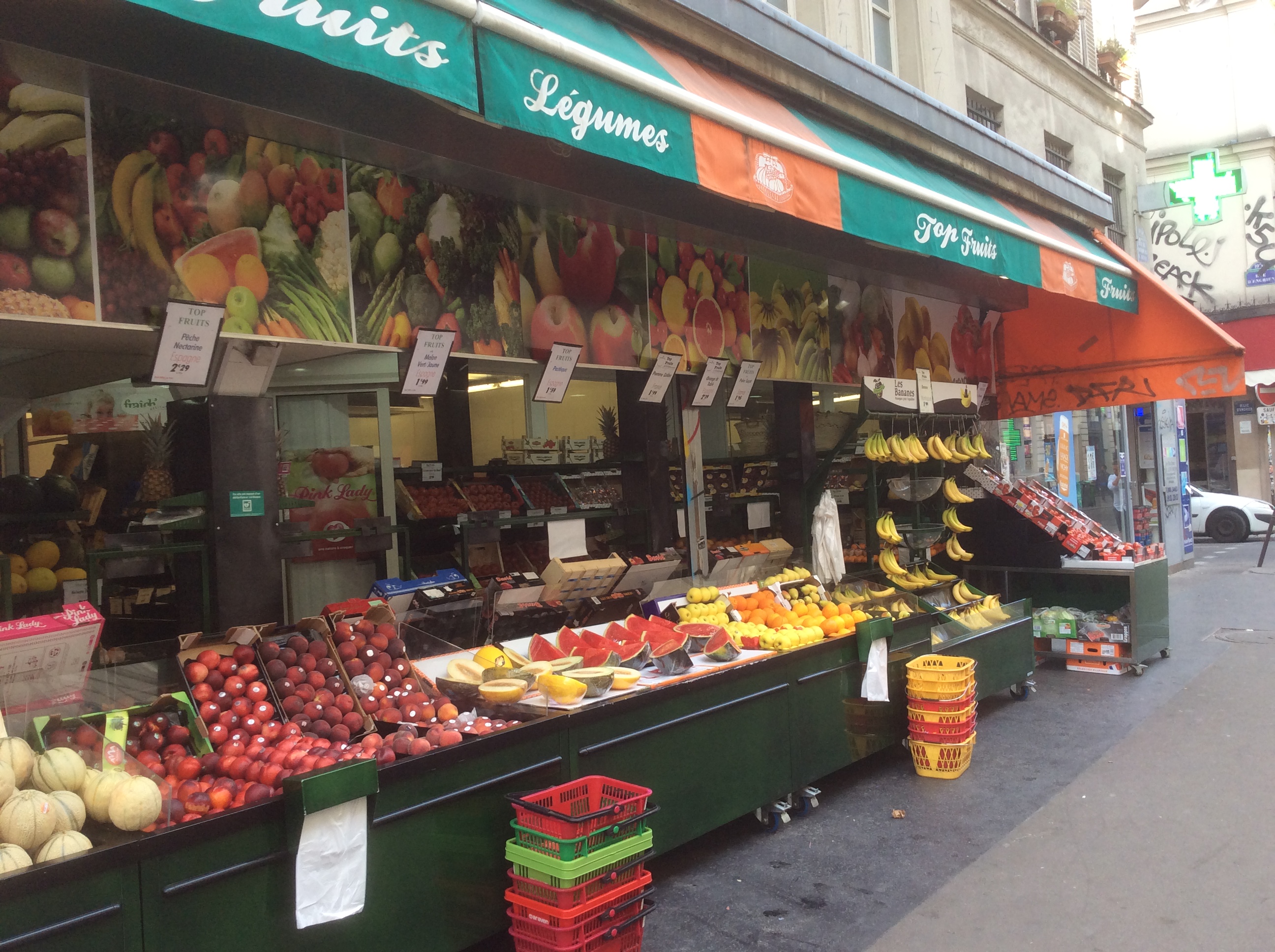 It’s a beautiful and still warm, and Bd. St-Denis, like Bd. Montmartre, is thronged with people greeting friends, walking their dogs, shopping the produce markets, hawking flowers, and eating and drinking at the cafes, with a few drinking in the street and getting a little rowdy. As I mentioned in my earlier post about this street, it reminds me of the old Mission district in San Francisco, and I love it. The crowd is multiracial, multicultural, rich, poor, and in-between. There are cafes and little food markets offering foods from around the world: Indian, Pakistani, Bangladeshi, and Turkish, to name a few, and the large produce markets, open to the street, offer a colorful array of fruits and vegetables.