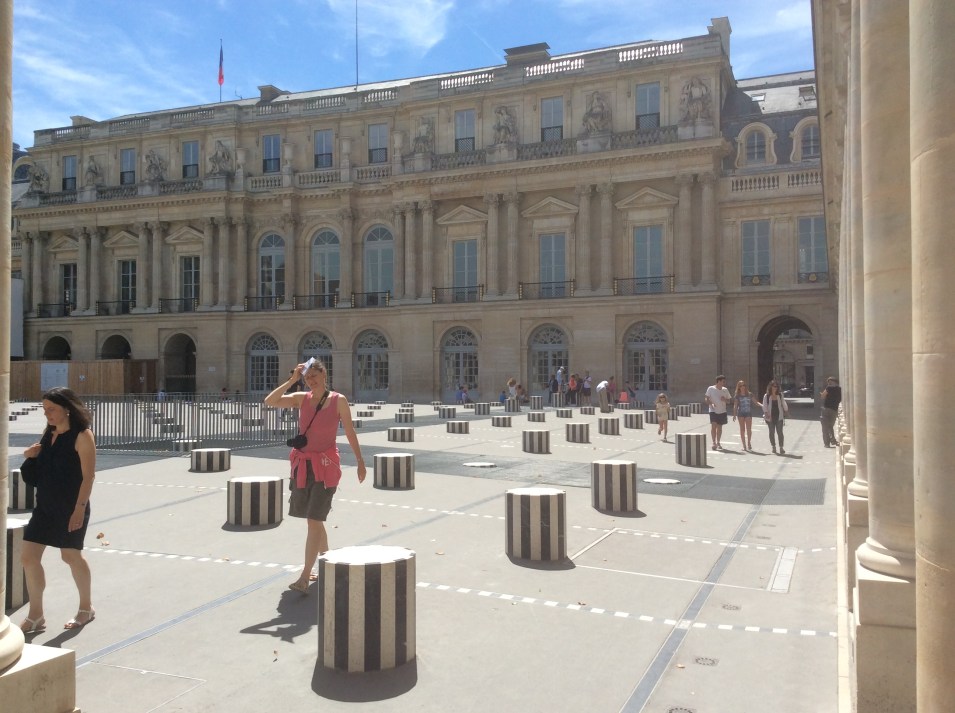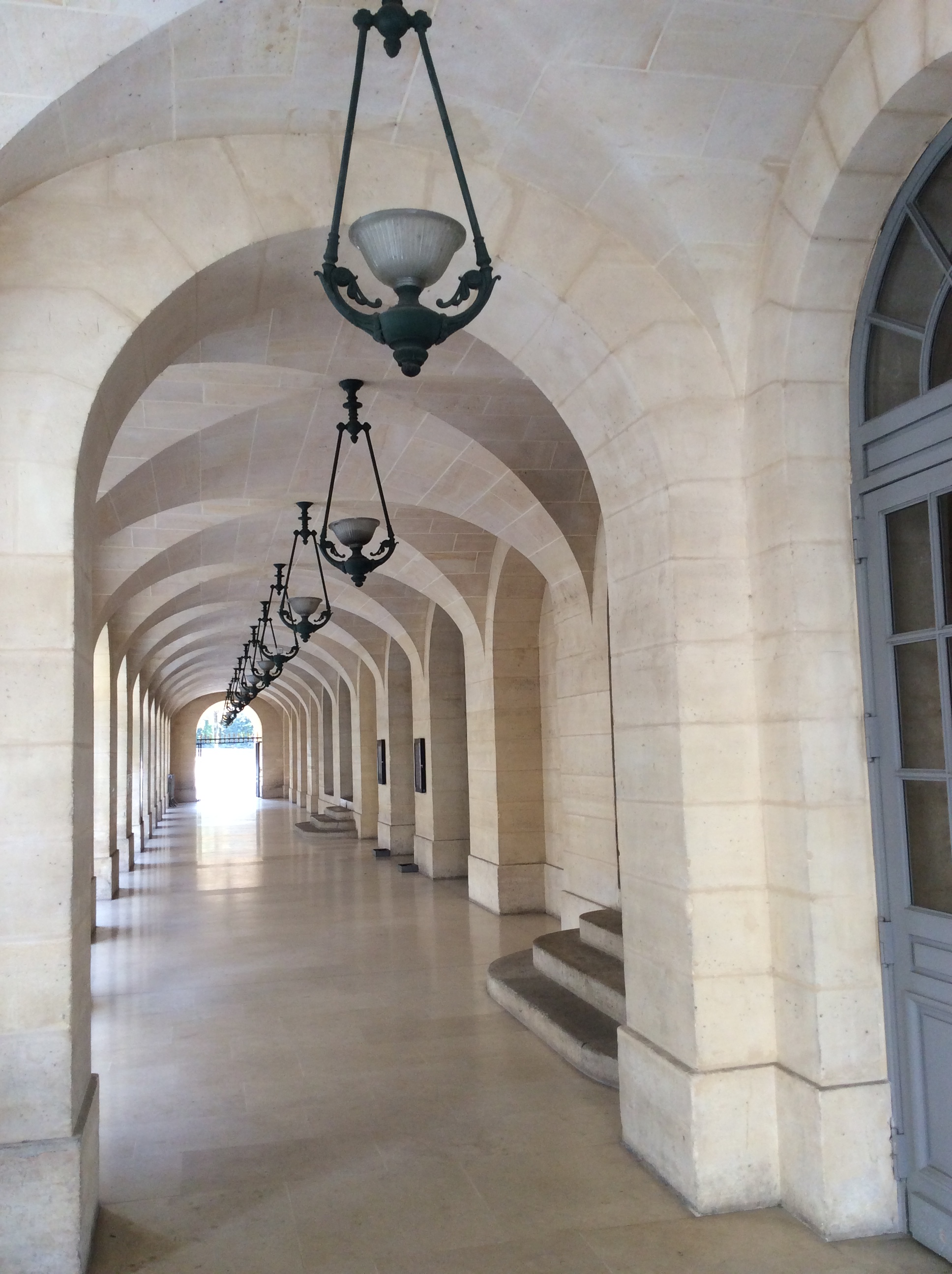 The next site I visit is the Palais Royal, just down the way towards the river. Thomas Jefferson visited the Palais Royal on August 6th, 1786 and other occasions (it’s especially easy to track the movements of Jefferson, being a prolific letter writer and meticulous record keeper). The Palais was a public shopping, entertainment, arts, and business center, originally the home of Cardinal Richelieu for whom the street that runs parallel to it is named, then expanded and updated by the Dukes d’Orleans. It was known for attracting revolutionaries, dissidents, writers, Freemasons, and prostitutes. I approach it from the back garden area, enclosed and crisscrossed by collonades in a classical style, a later addition that Jefferson would certainly have approved of. It’s a lovely shady spot to rest in on this hot day.