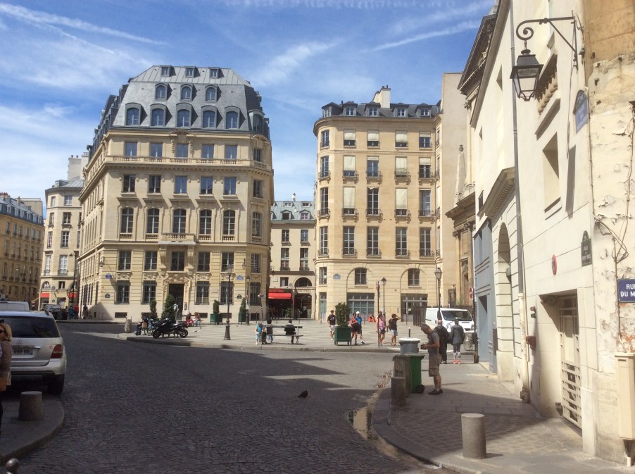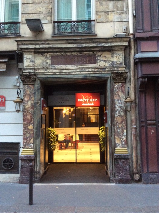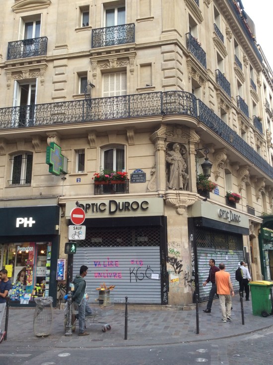 Last night, I arrive a bit late, having cheered on my husband on as he set off on the Paris-Brest-Paris ride in Saint Quentin en Yvellines, a suburb near Versailles. I’m back from Berlin and Saint Quintin, staying this time at 136 rue Montmartre, another Airbnb bargain. The red front door of my room enters a narrow white building decorated from top to bottom with two rows of classical statues in niches, and opens to a shabby, ancient spiral stairway. Though my room is plain with ugly and mismatched furniture, it’s roomy and spic-and-span, with a big comfortable bed with crisp clean bedclothes. My thoughtful host has every basic need stocked: bottles water of water chilled in the fridge (bubbly and still), decent coffee, soap and shampoo, even band aids (I can’t be the first traveler to have stayed here who have walked too far in shoes that are too new for a full day of walking. Two painful blisters are the inevitable result). I settle in happily, get a good night’s sleep, and then…