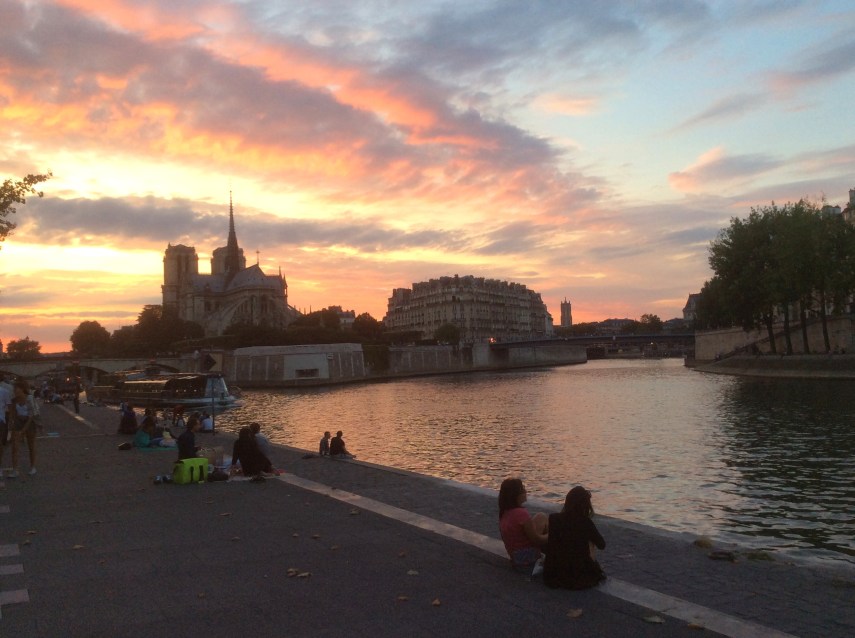 The sunset is pink, orange, and gold against the blue sky and above the silver Seine as I pass by Notre Dame.