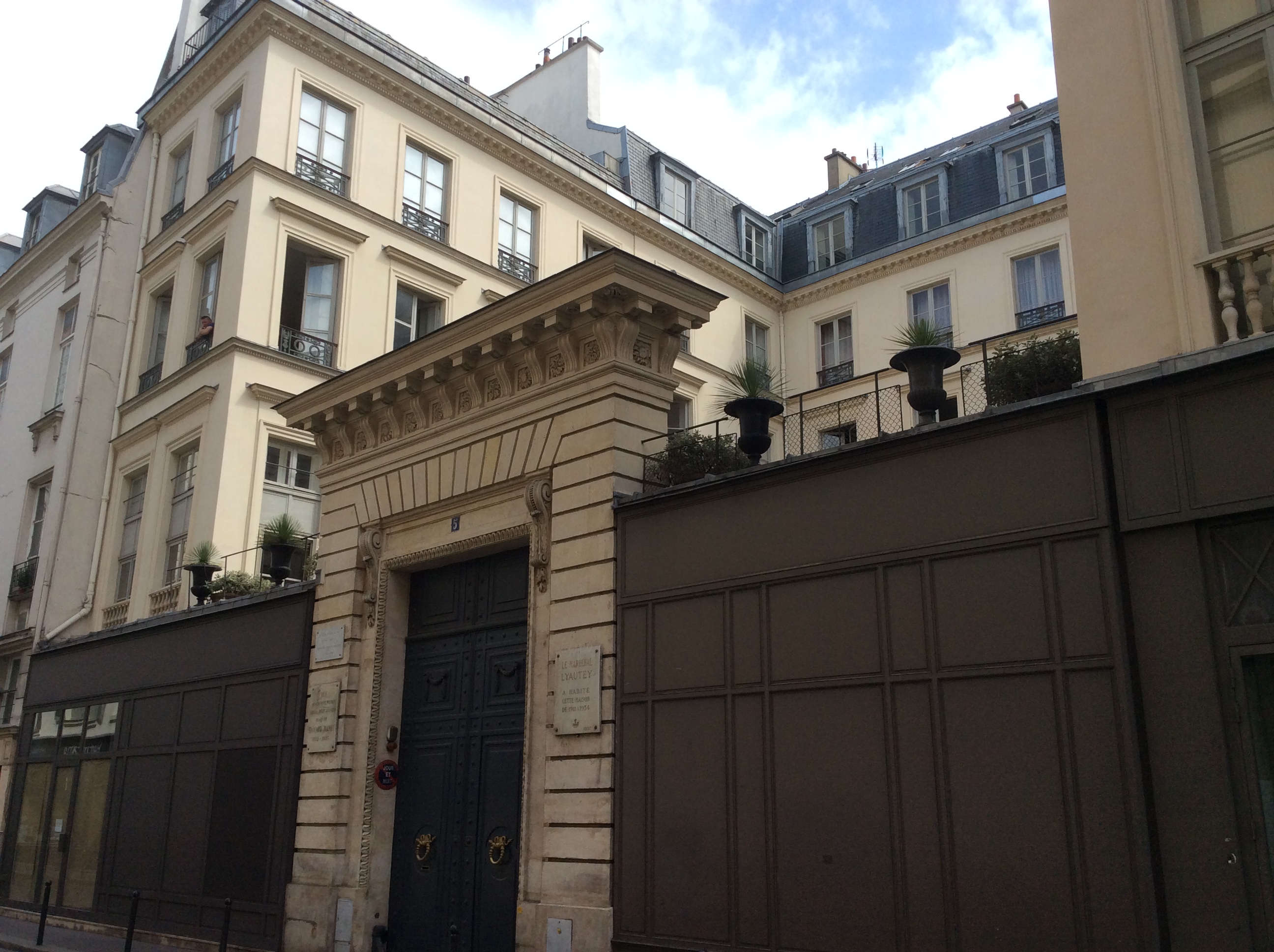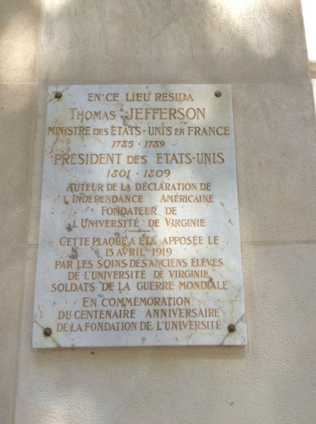 So, Jefferson sold up and moved to the Hôtel de Langeac. It turned out to be a perfect compromise between his love of culture and its refinements, and his moral preference for rural living. At that time, it was on the outer edges of Paris, halfway between the bustle of the city and the peace of the Bois (woods) de Boulogne, which he visited nearly every day. Horseback riding was among his favorite forms of exercise, and he could let the horse really go in this natural setting. Now, however, the full bustle of Paris has enveloped Hôtel de Langeac’s street corner and beyond. As I was absorbed in finding a good angle to photograph the building, I was startled to realize that some of the honking and shouting I was hearing in the background was aimed at me: turns out I was standing right in the driveway of a subterranean parking garage, which lets out right in the middle of a wide sidewalk. Oops.