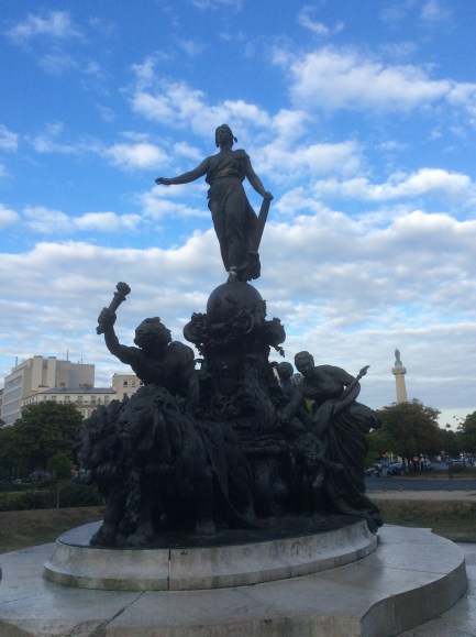 I walk down Boulevard Voltaire in search of something better to eat than airplane food, which takes me awhile: most places are closed (usual in late July to mid-August, as my host informs me), until I get closer to Place de la Nation, which is is getting busier as the night crowd are starting to emerge. I find a boulangerie, where I pick up a butter croissant and another sweet one for tomorrow’s breakfast. I admire the sculpture, then turn up Boulevard Diderot, sit down for an Edelweiss (lightly tart beer), a couple of smokes (an old habit I like to indulge myself in on special occasions) and a little people-watching. It’s a lovely warm evening.