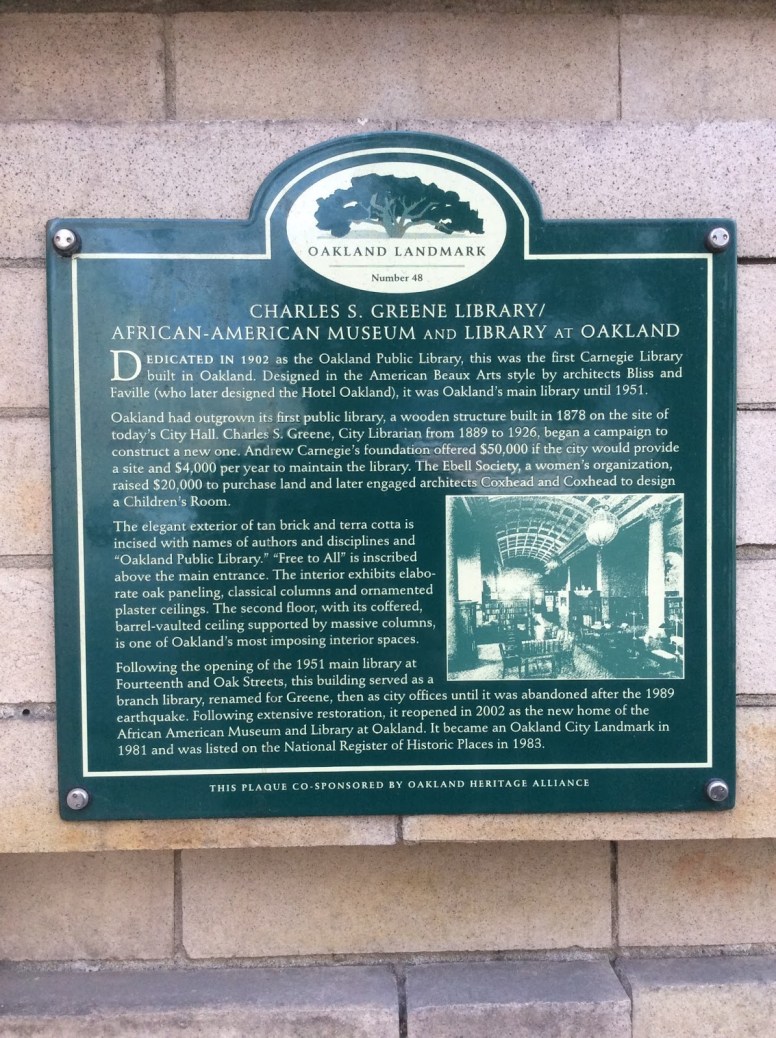 For the last several weeks, I’ve been gathering materials at my local library branch, the main branch near beautiful Lake Merritt on 14th St. But for many happy afternoons this early December, I’m on the other side of downtown, still on 14th St, in my new favorite study space, the lovely African American Museum and Library in Oakland.The AAMLO is a local Beaux Arts gem, the original main library building from 1902 until it moved to its current much larger location in the early 1950’s. (See the photo, right, of the museum’s green plaque for a brief history of the library and museum; you can click on the image to enlarge it for ease of reading, if you like.)