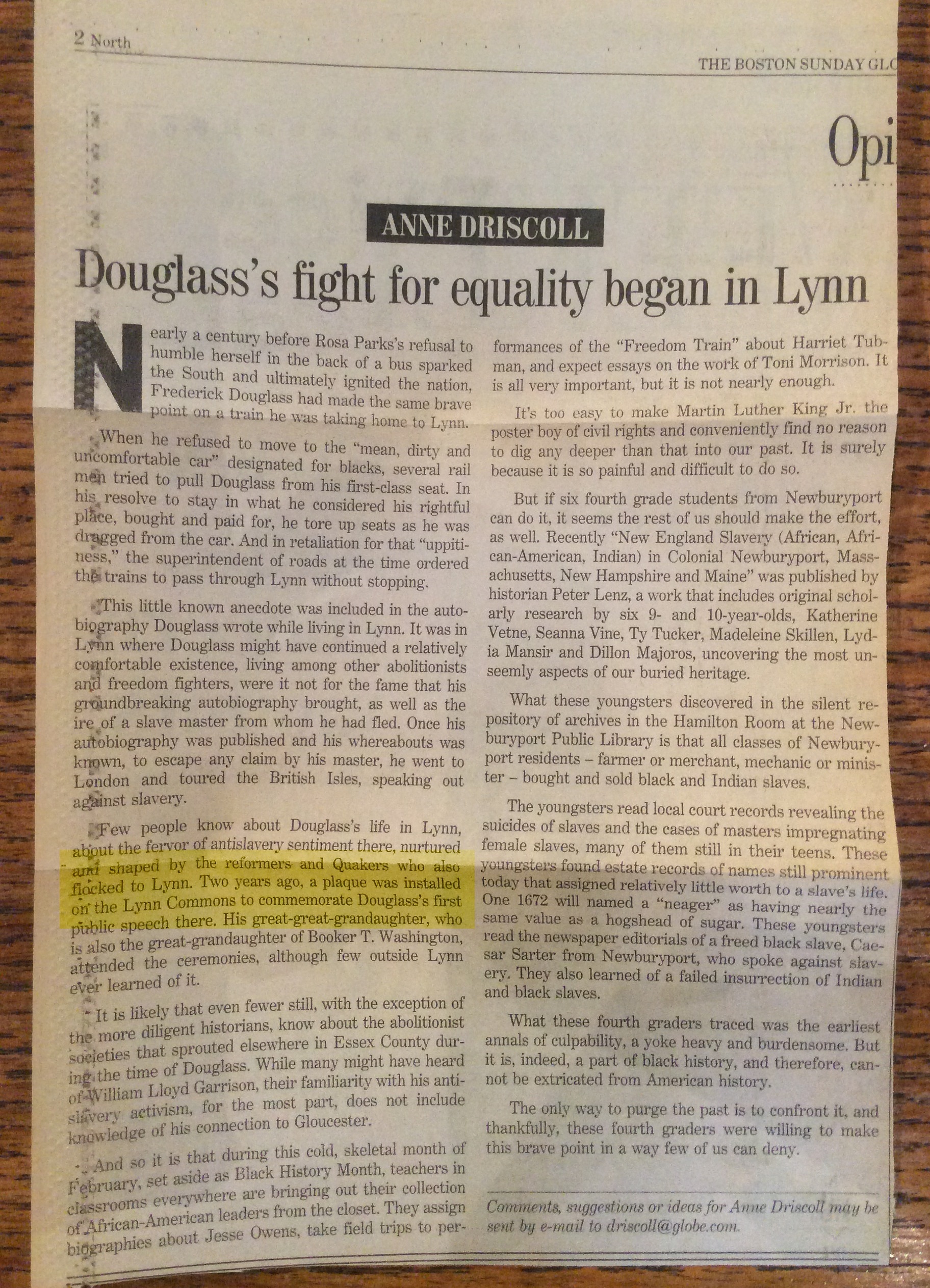 I find many other old newspaper clippings in this folder, some of which I’ve shared with you already in the first part of my account of today’s visit to Lynn, others which I’ll share with you as they relate to my further discoveries on my Douglass journey, and still others I’m happy to share upon request. But I’ll go ahead and end this account here for time’s sake, and soon follow this with the tale of my next day’s discoveries.