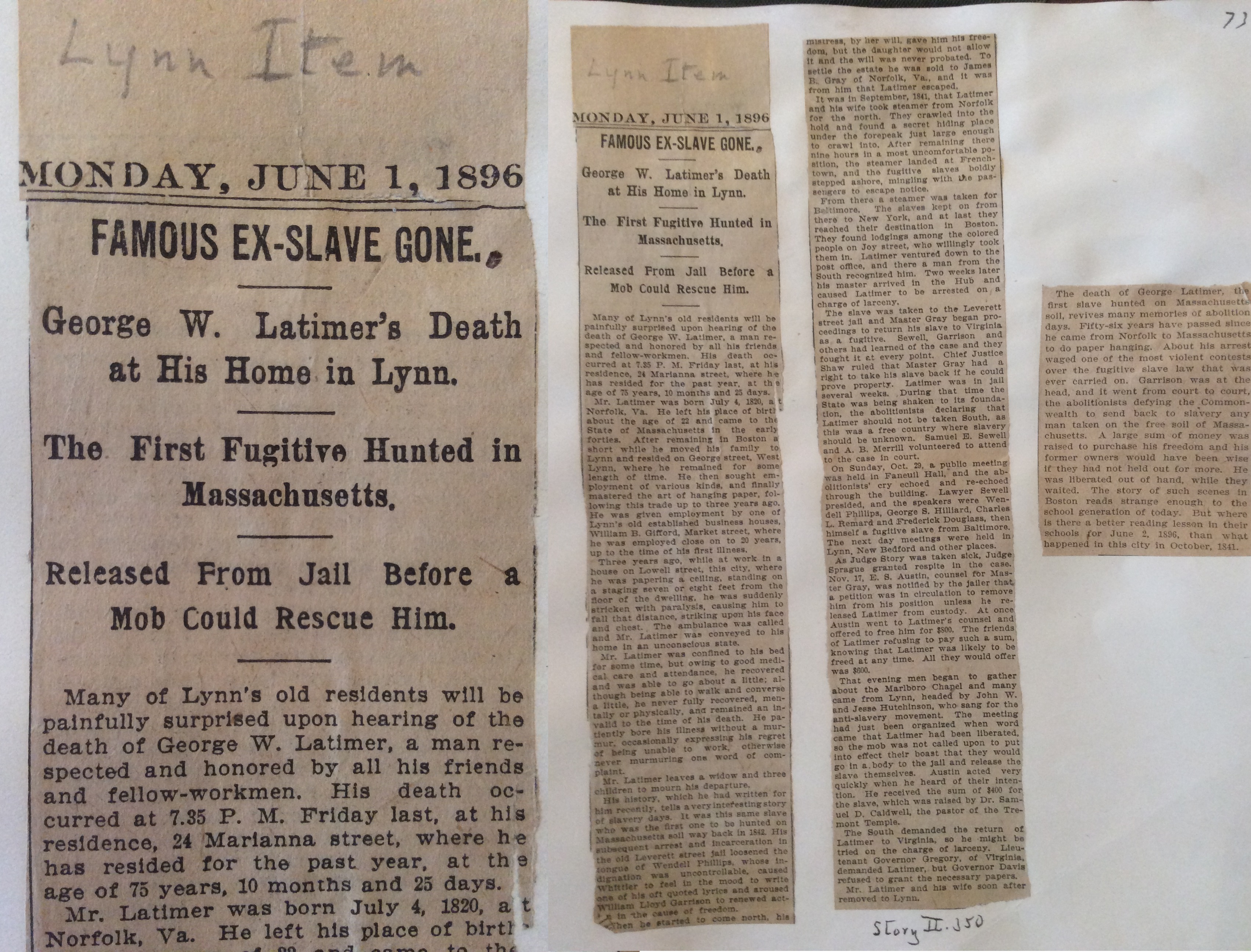 The clipping tells the story of George Latimer, a former slave who escaped with his wife Rebecca to Baltimore, than onto Boston, where George was arrested; after Latimer’s freedom was finally purchased, he and his wife settled in Lynn. I had read this story in my research on Douglass; it was disputes over slaves escaping north, such as the Latimers, that led to the passage of the Fugitive Slave Act, since the slavecatchers had pursued Latimer into a free state. And as you can see in the newspaper account (you can open the image in a new tab and zoom in to read), Douglass, William Lloyd Garrison, and Wendell Phillips were champions for Latimer’s cause and held meetings in Boston’s Faneuil Hall, where I visited yesterday. You’ll also see that Jesse and John Hutchinson were among the activists protesting Latimer’s treatment, that the pastor of Tremont Temple Samuel Caldwell paid the $400 that purchased his freedom (paid his ransom?), and that Latimer and his wife were taken in by people on Joy Street, on Beacon Hill in Boston; I walked that street just yesterday as well.