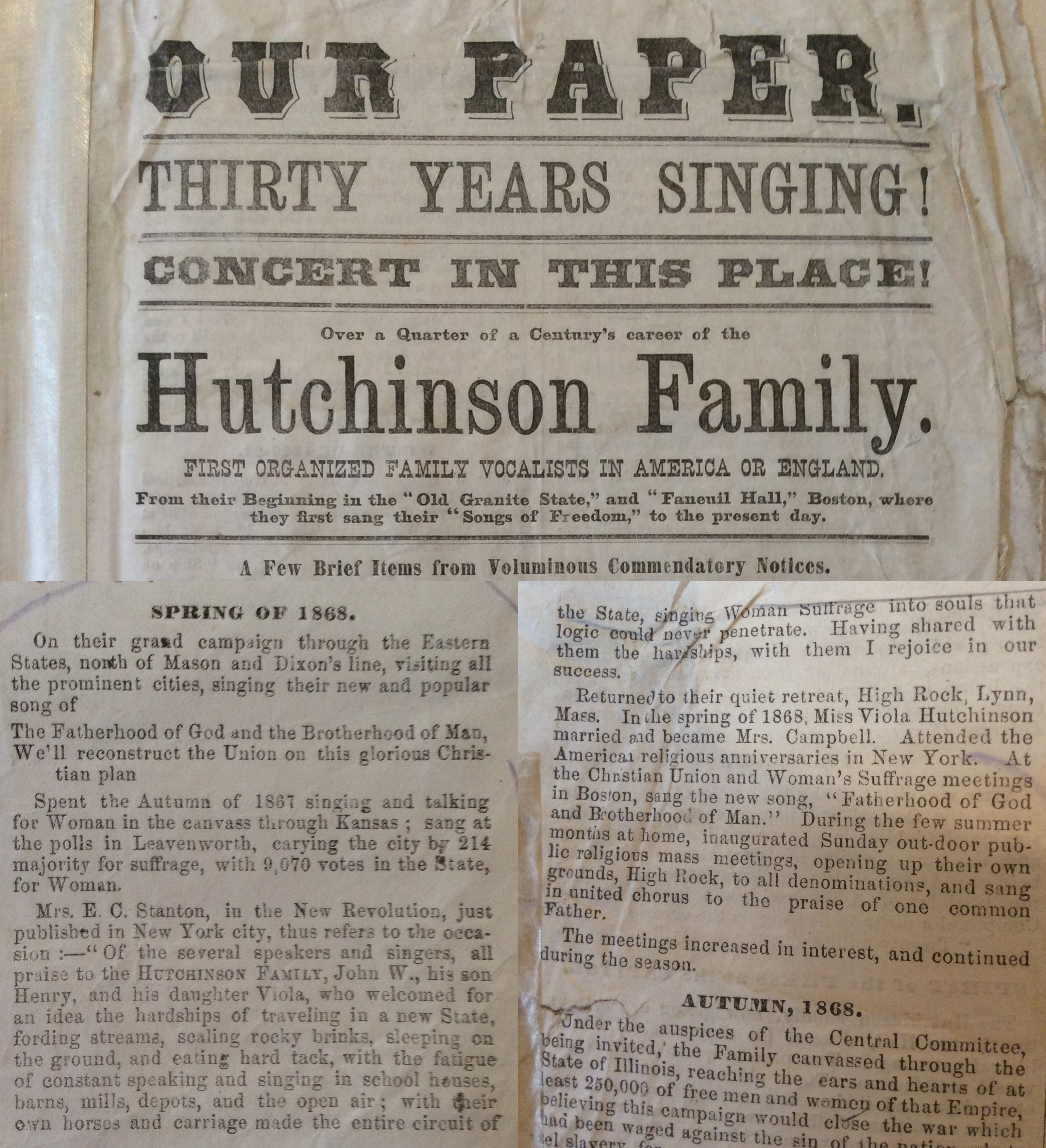 Hutchinson Family Paper celebrating over 25 years as a group, with a ringing endorsement by feminist leader and Douglass’ friend Elizabeth Cady Stanton