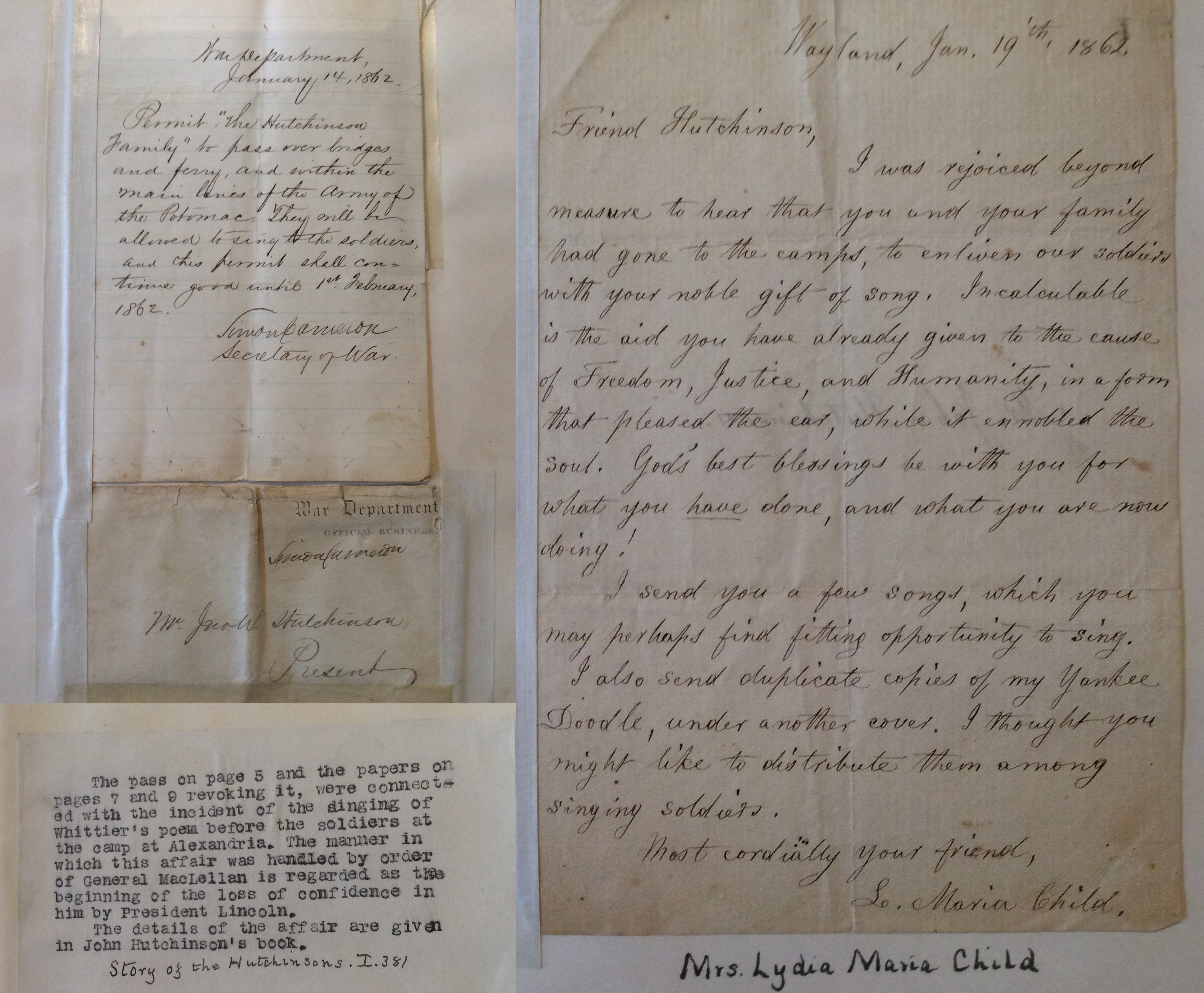 Civil War free pass and letter from Lydia Maria Child to John Hutchinson, Lynn Museum & Historical Society. The Hutchinson family would sing for the troops, by special permission of the Secretary of War, to cheer and inspire them. The great human rights activist and author Child applauds this in her letter to John of January 19th, 1862.