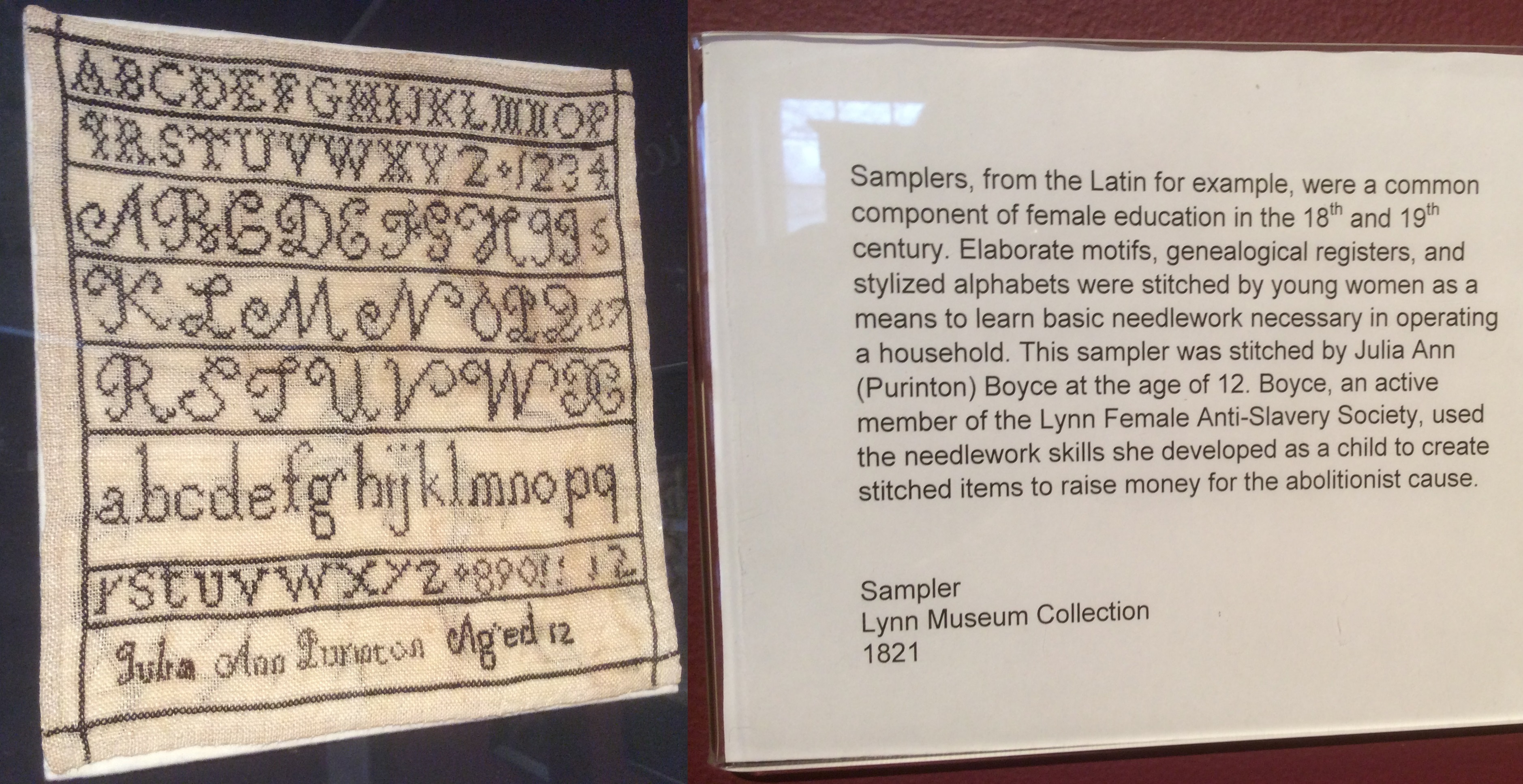 A seamstress and textile artist myself, I enjoy the exhibit of needlework artifacts here, created by the girls and women of Lynn’s abolitionist community to raise money for the abolitionist cause.