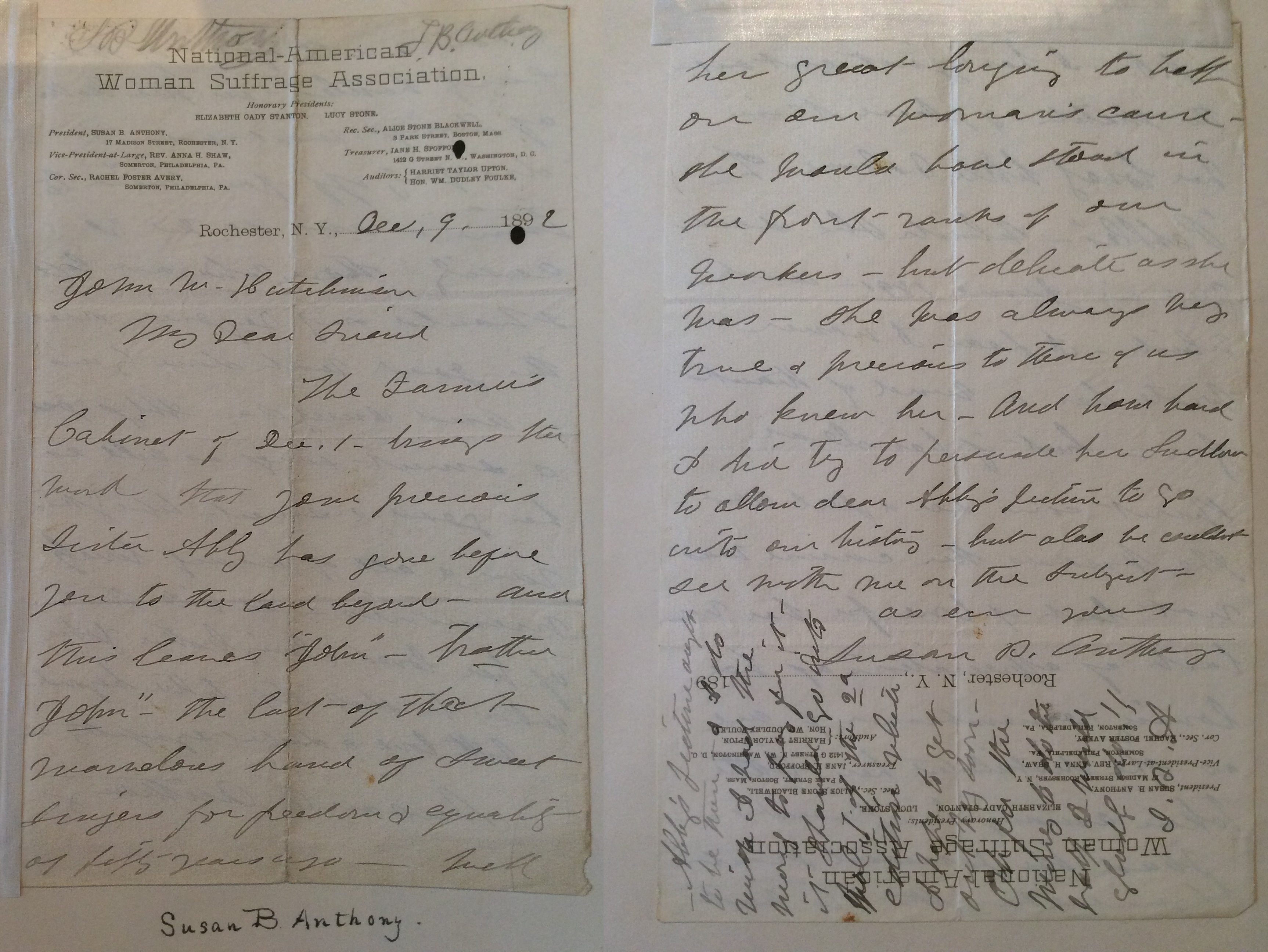 Letter from Susan B. Anthony to John Hutchinson, December 9th 1892, sending condolences for the death of his sister Abby, an especially talented member of the group and also, as Anthony says here, dedicated to the women’s rights cause