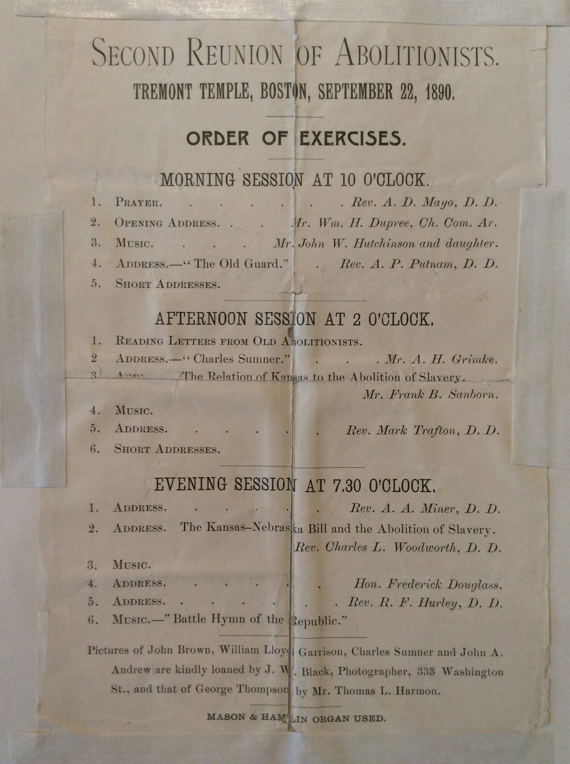 Poster for Second Abolitionist Reunion at Tremont Temple in Boston, September 22nd 1890. As you may remember from my account of my day in Boston visiting Douglass sites, he spoke here often, and as you can see from the poster, he shared the stage with John Hutchinson and his daughter Viola, who donated the scrapbook to the Lynn Historical Society (see cover photo above). They close the meeting with Howe’s ‘Battle Hymn of the Republic’