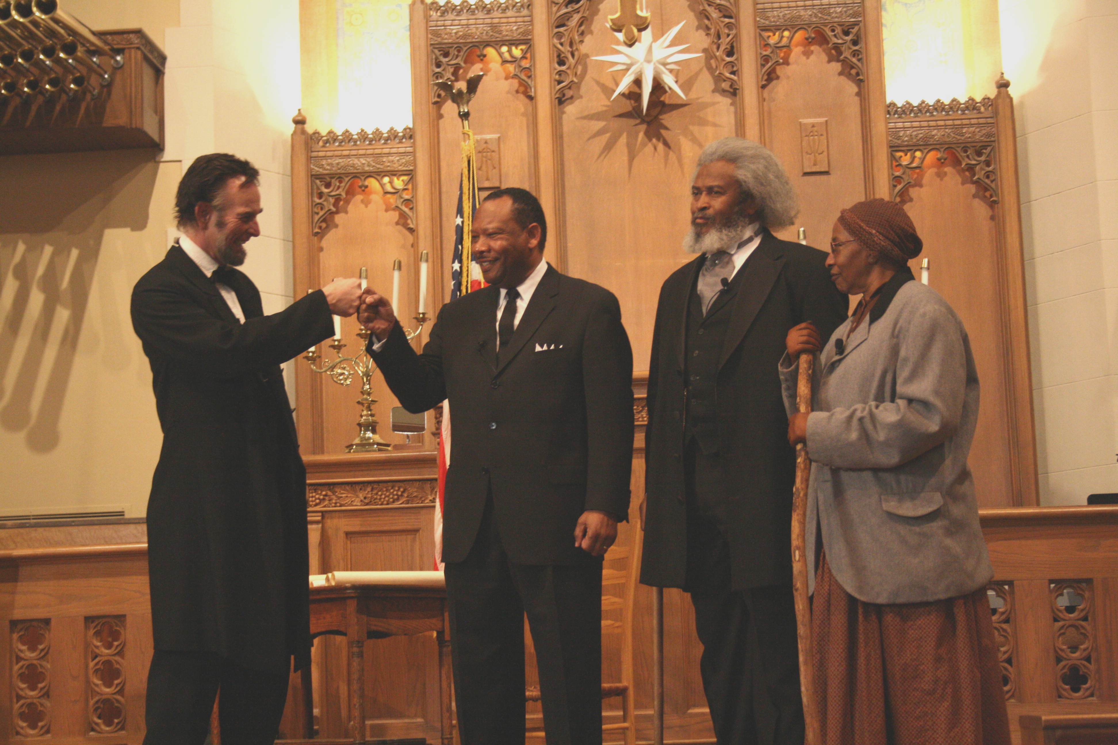 Frederick Douglass Michael Crutcher), Abraham Lincoln (Fritz Klein), Martin Luther King Jr (Jim Lucas), and Harriet Tubman (Kathryn Harris) as portrayed in ‘Emancipation and the Dream of Freedom: From Slavery to the White House’, Lincoln Home bicentennial celebration event, 2009 by Michael A. Roth for the National Park Service. Photo used by permission.