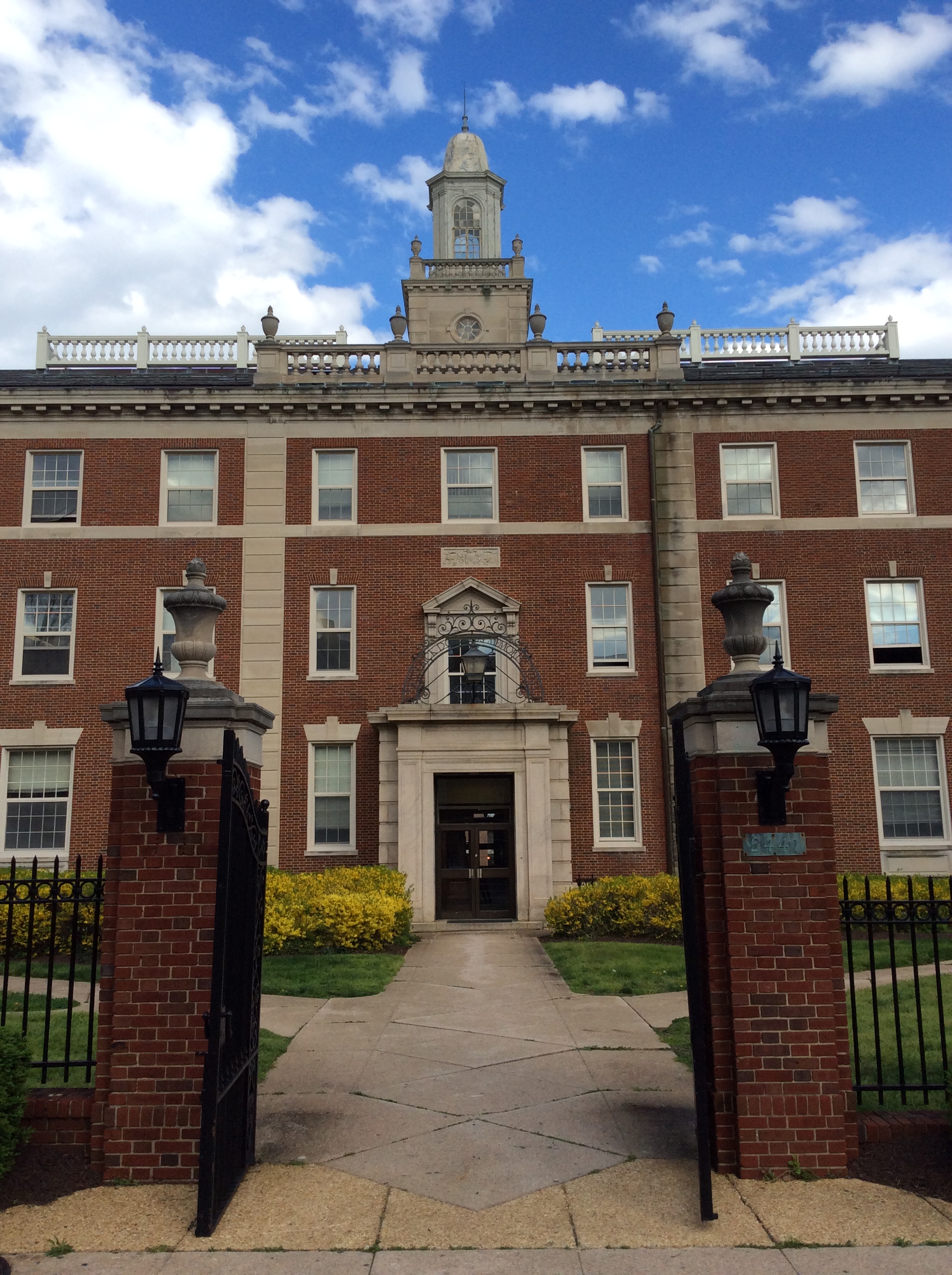 Frederick Douglass Memorial Hall at Howard University, gated entrance facing onto 6th St NW, Washington, D.C.