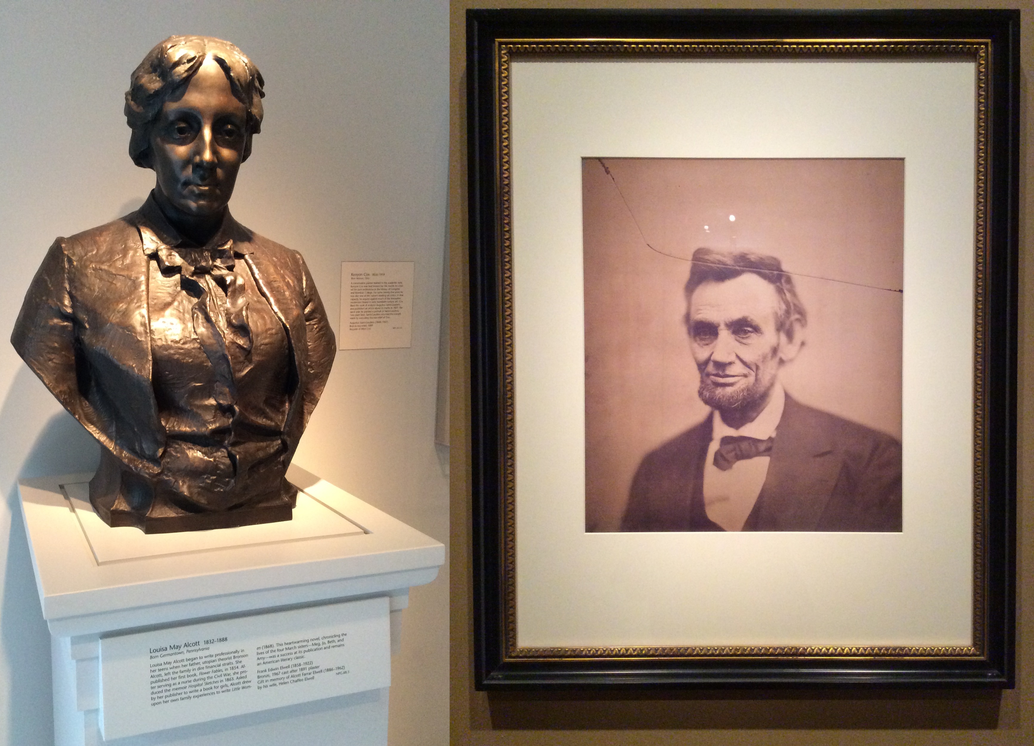 Left, bust of Louisa May Alcott, sculpted by Frank Edwin Elwell, 1891. Right, Abraham Lincoln a month before his second inauguration, portrait by Alexander Gardner, February 5, 1865. National Portrait Gallery, Washington D.C.