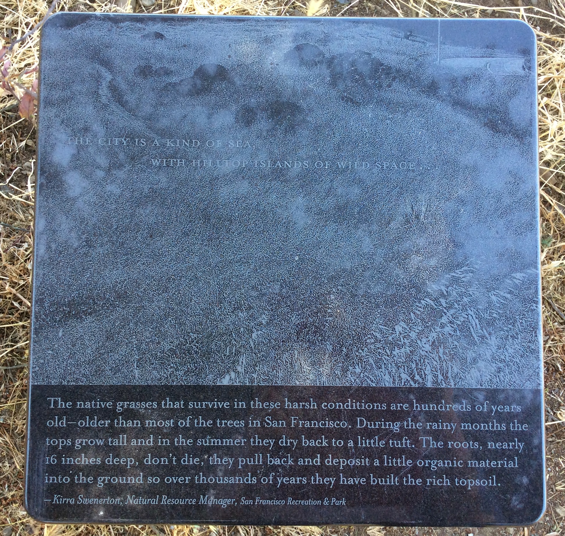 A marker which tells about the native San Francisco grasses here in McLaren Park