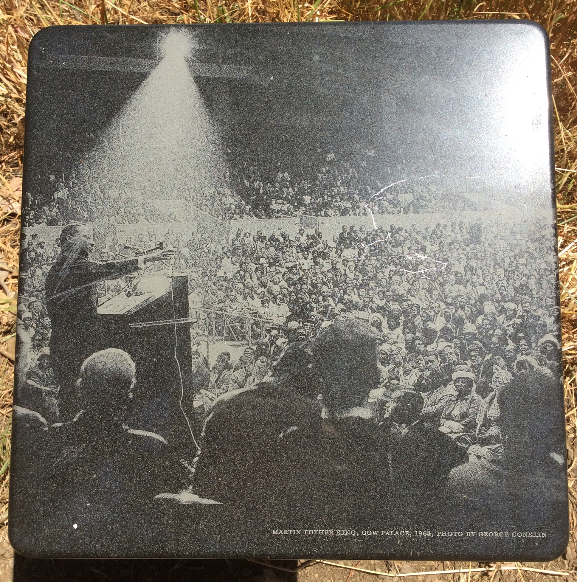 martin-luther-king-marker-at-cow-palace-overlook-philosophers-way-sf-2016-amy-coolsThere’s an overlook with a clear view of the large, sideways half-cylindrical shape of the Cow Palace, a large forum where, it turns out, Martin Luther King Jr. once spoke. An interesting tidbit of local history!