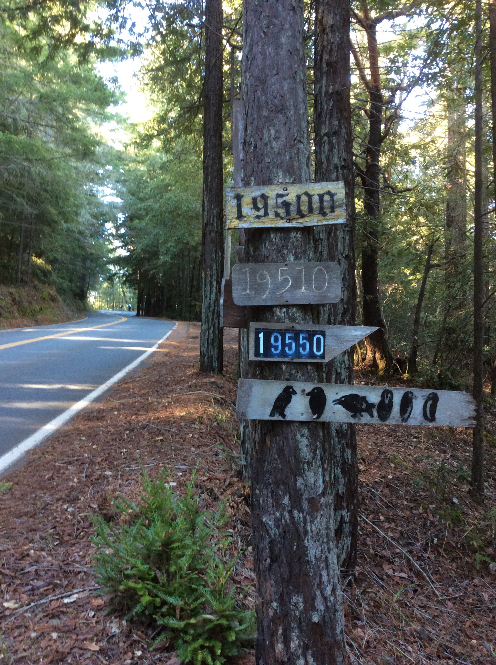 Signs on a post off Mountain View Road, rising out of the Anderson Valley, California