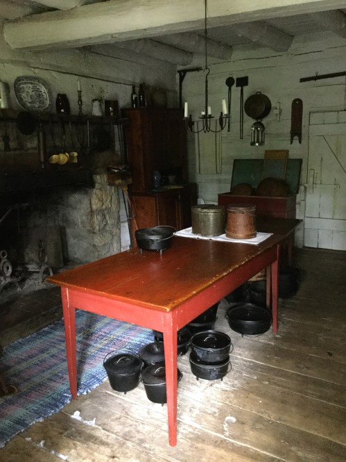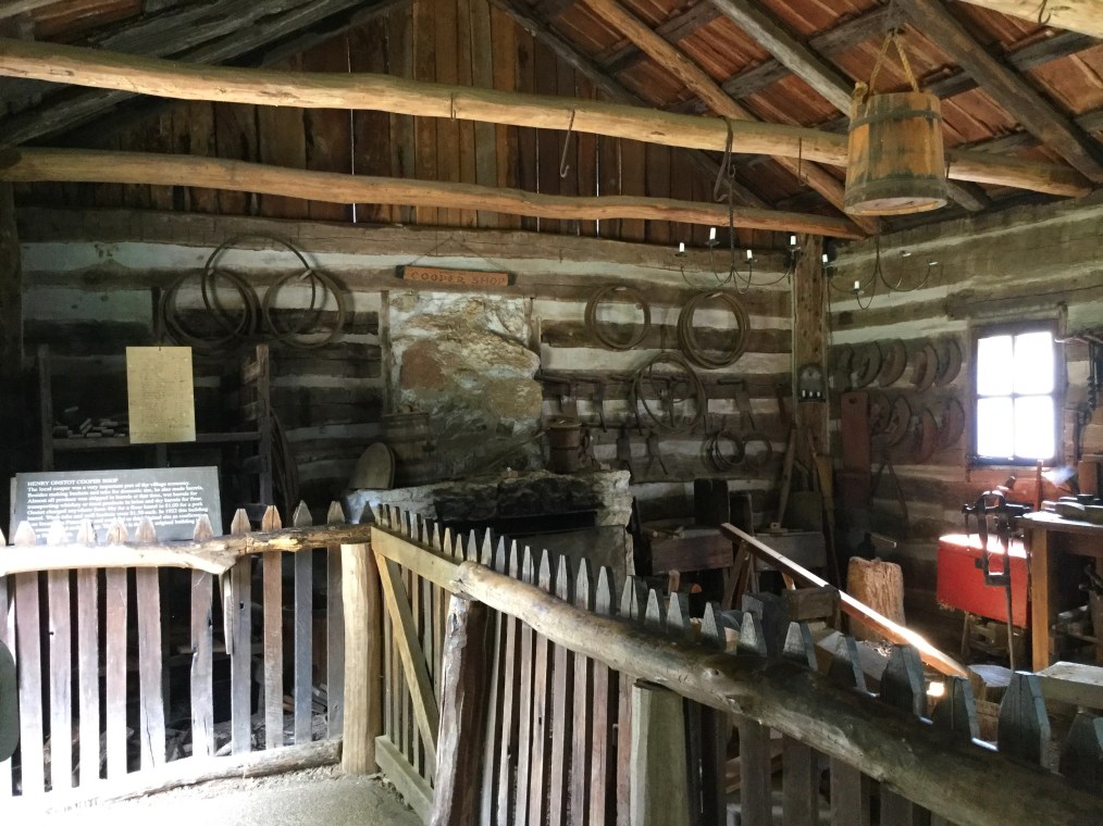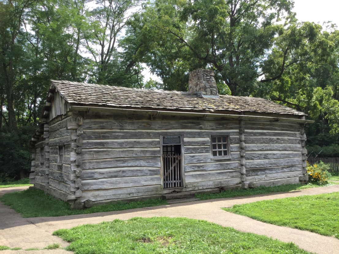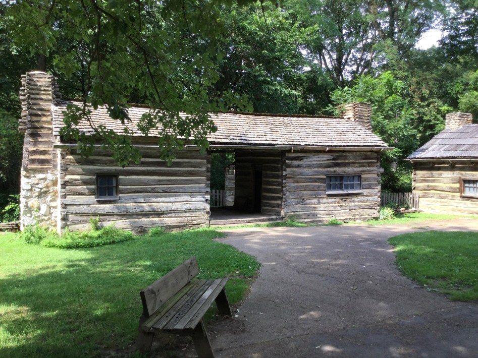 I find that some of the volunteer interpreters are not deterred today by the heat or the lack of an air-conditioned space to retreat to. Two men in early-to-mid 19th-century costume roam the park under shady, battered straw hats, recounting the history of New Salem and anecdotes from Lincoln’s life here. Some kind soul(s) placed large coolers here and there filled with ice water as well. It’s a lovely place to wander, and I take my time exploring. Though I visit all of them, there are so many structures that I’ll just show and tell of the ones that have some connection to Lincoln. The park contains 22 reconstructed and one original building from the New Salem of Lincoln’s time. The reconstructions are based on the findings from archaeological digs, on descriptions of the town from former residents, and on other representations of buildings, furniture, and tools from the same time period. Most of the buildings, as far as could be determined, are built on or near the original foundations. Many of the furnishings, equipment, dishes, and more are from that time period, too, collected locally.