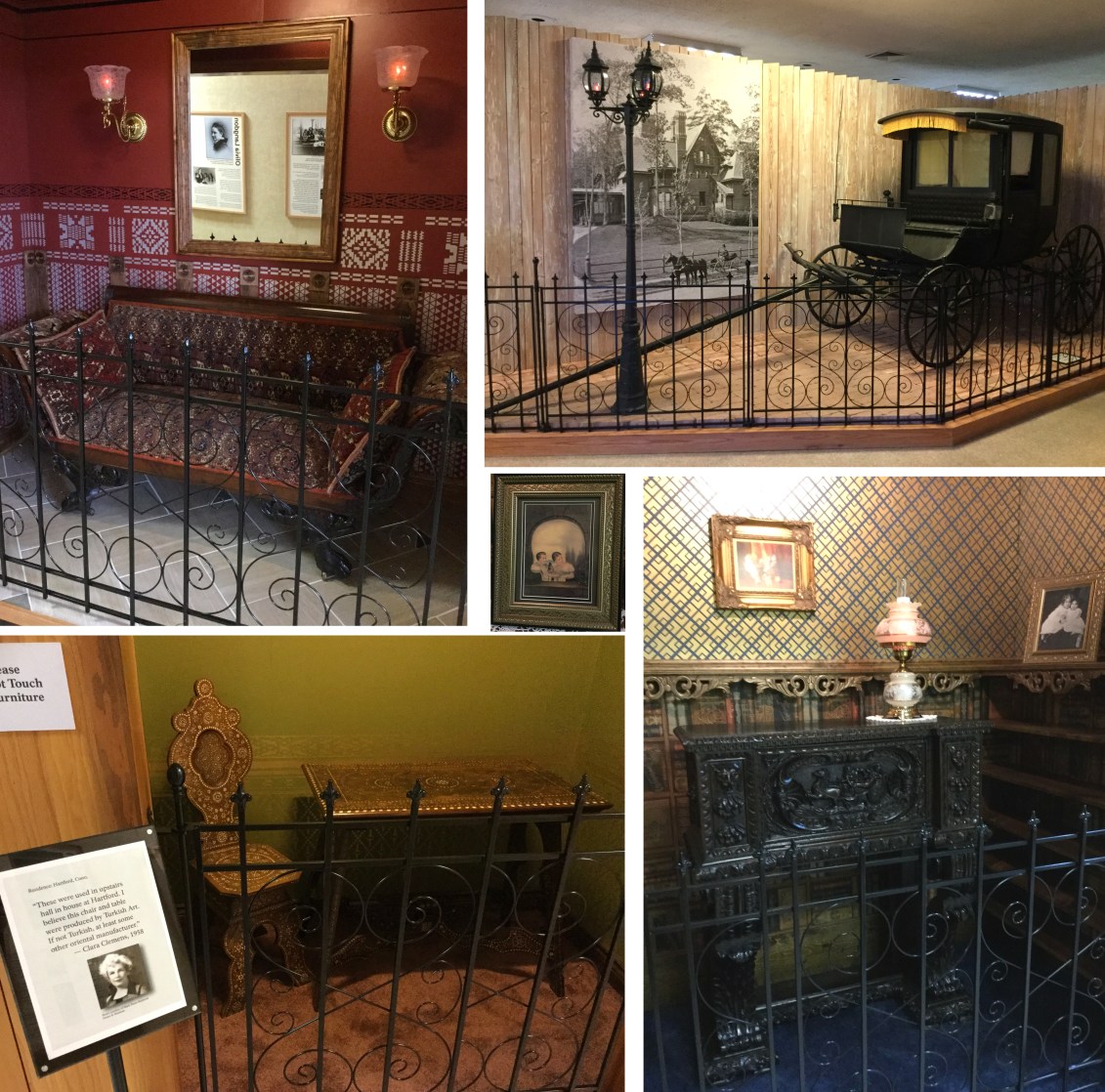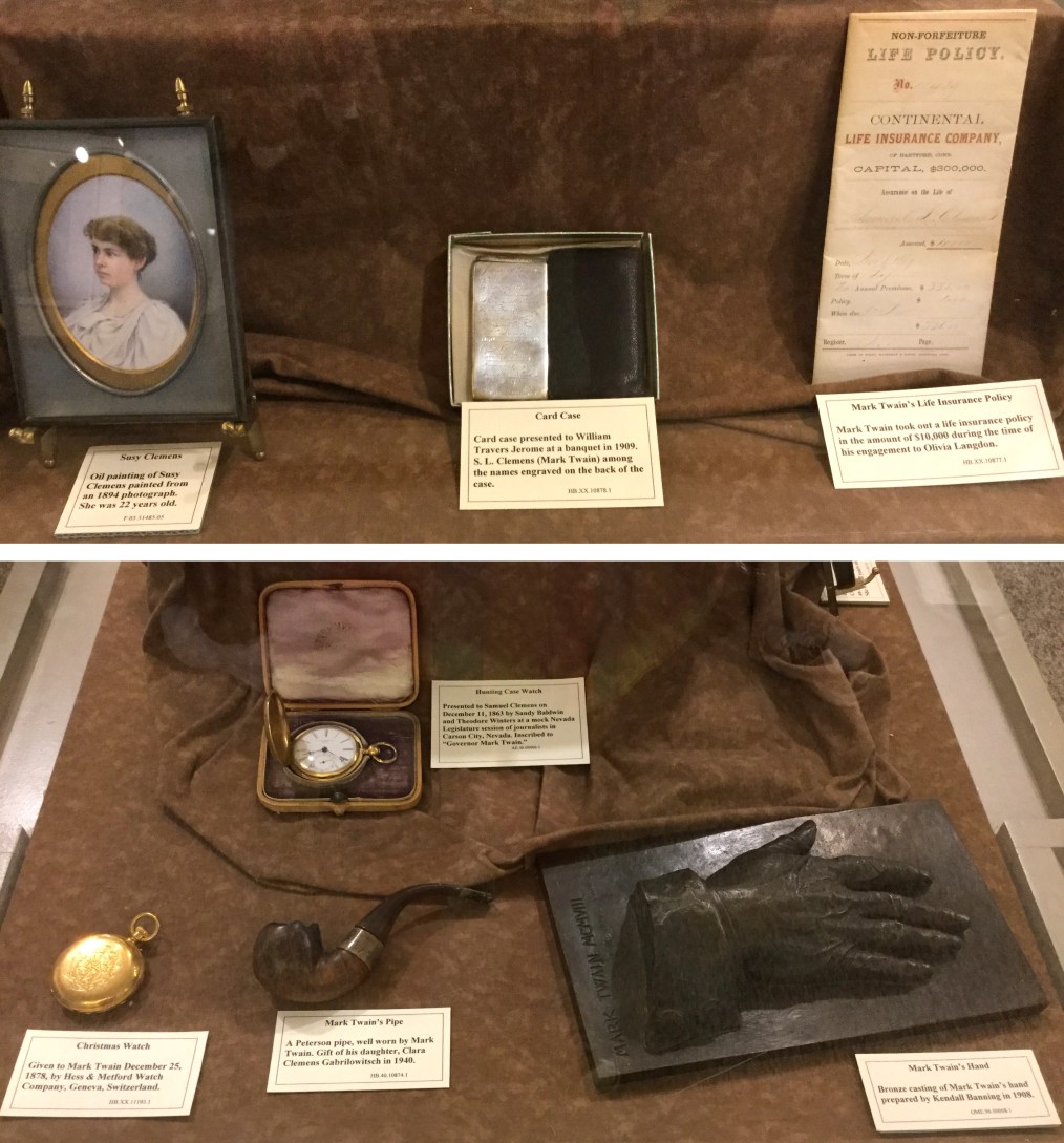 Collection of objects from the Clemens’ family home in Hartford, CT, at the Mark Twain Birthplace Memorial Site Museum in Florida, Missouri. Clara, the only daughter to outlive Mark Twain and Olivia Clemens, provided the stories of the family memorabilia here