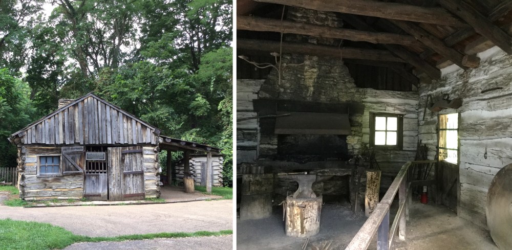 Exterior (left) and interior (right) of Joshua Miller’s blacksmith shop, New Salem