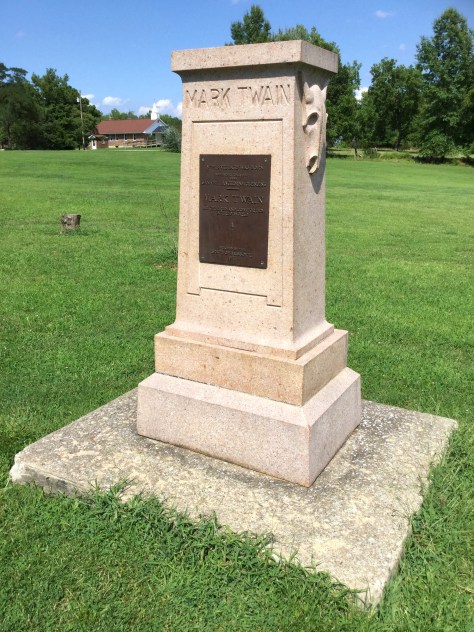 I leave the Birthplace museum and drive the half mile down the little county road that leads to the remnants of tiny Florida. Just off the road in a grassy field at what was once South Mill St, there’s a carved granite pedestal which marks it as the original site of Samuel Clemens’ birth. The pedestal used to support a bust of Twain, but the bust was also moved to the Birthplace museum to protect it from the elements. It’s a quiet, peaceful place here, with a few scattered homes and a church in view. It is now, as it was then, an improbable place to produce the restless, cosmopolitan iconoclast and self-created character Mark Twain.