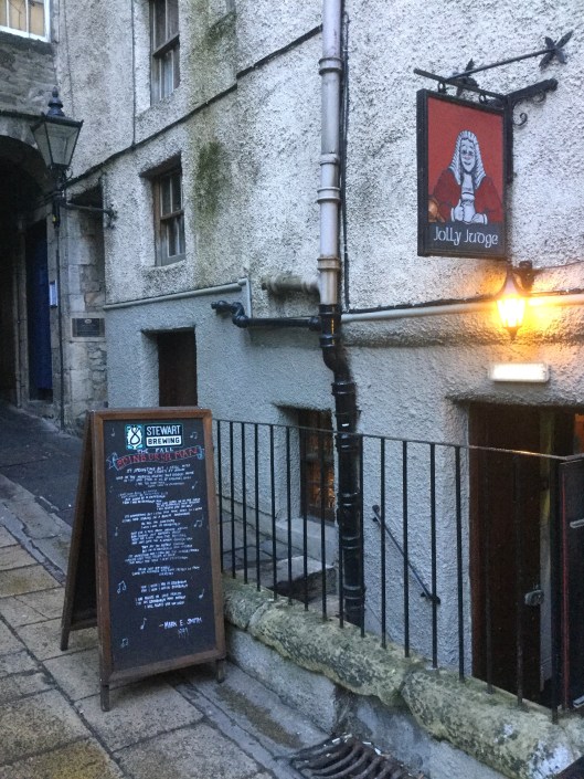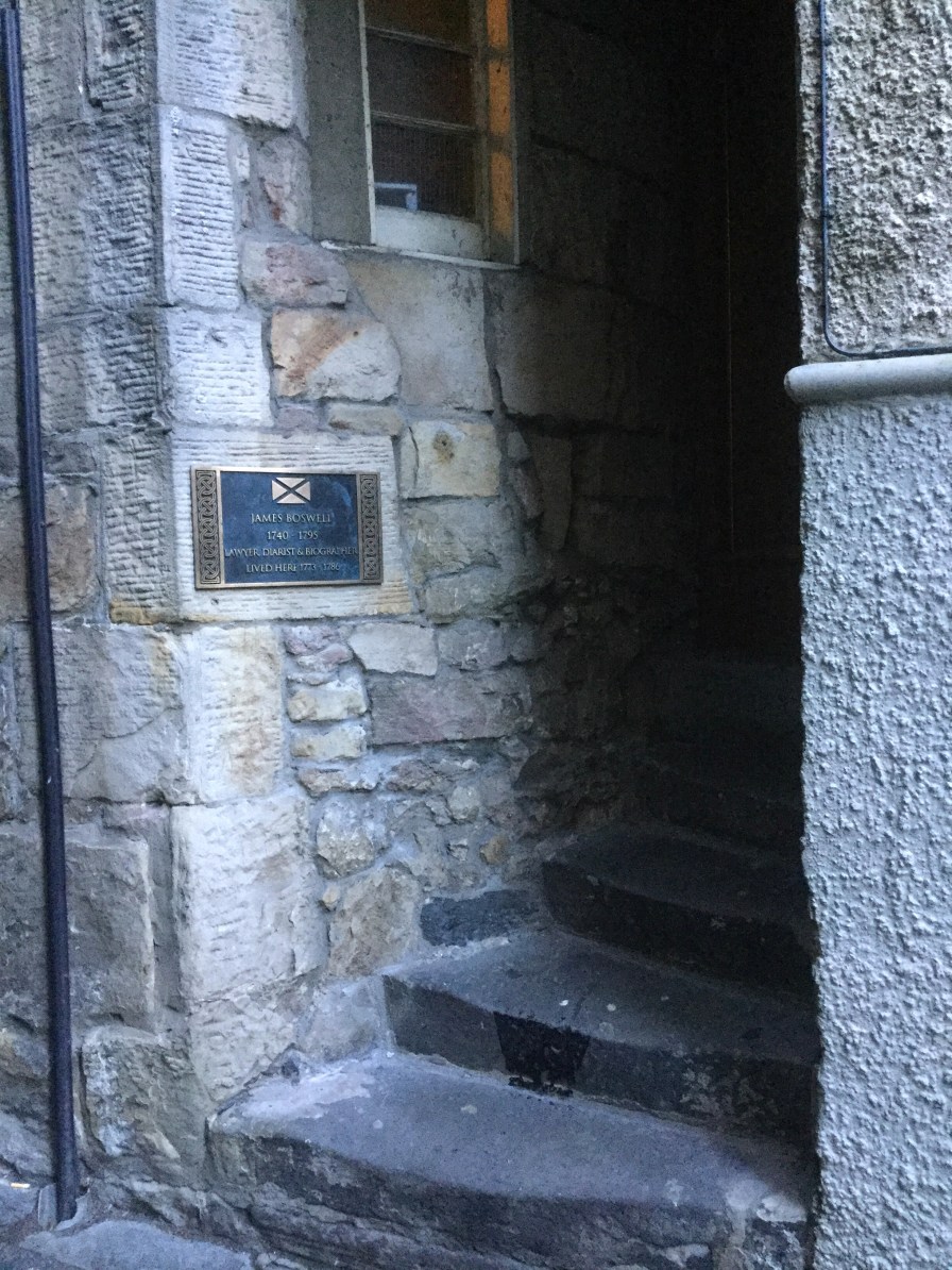 The site of James Boswell’s place in James Court off the Royal Mile is near one of my favorite pubs in Edinburgh: the Jolly Judge. You can see the plaque on the wall near the doorway just beyond the lamp.