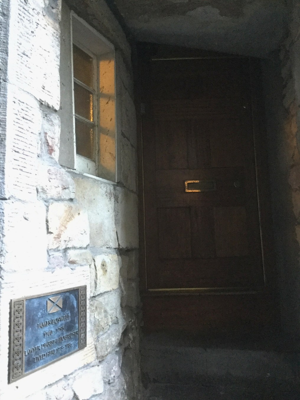 In James Court, just off Edinburgh’s famed Royal Mile, there’s a little winding set of stone steps leading to a simple wood door. The plaque near the steps reveals that they lead to the place where James Boswell lived from 1773 to 1786. The first flat that Boswell occupied in James Square was torn down, but the recently discovered remains of a very old staircase in one of these oft-reconstructed buildings may be the one which linked the two floors of his home. From what I’ve read thus far, it seems this marked building, site of Boswell’s second flat here in James Court, contains only parts of the original structure.