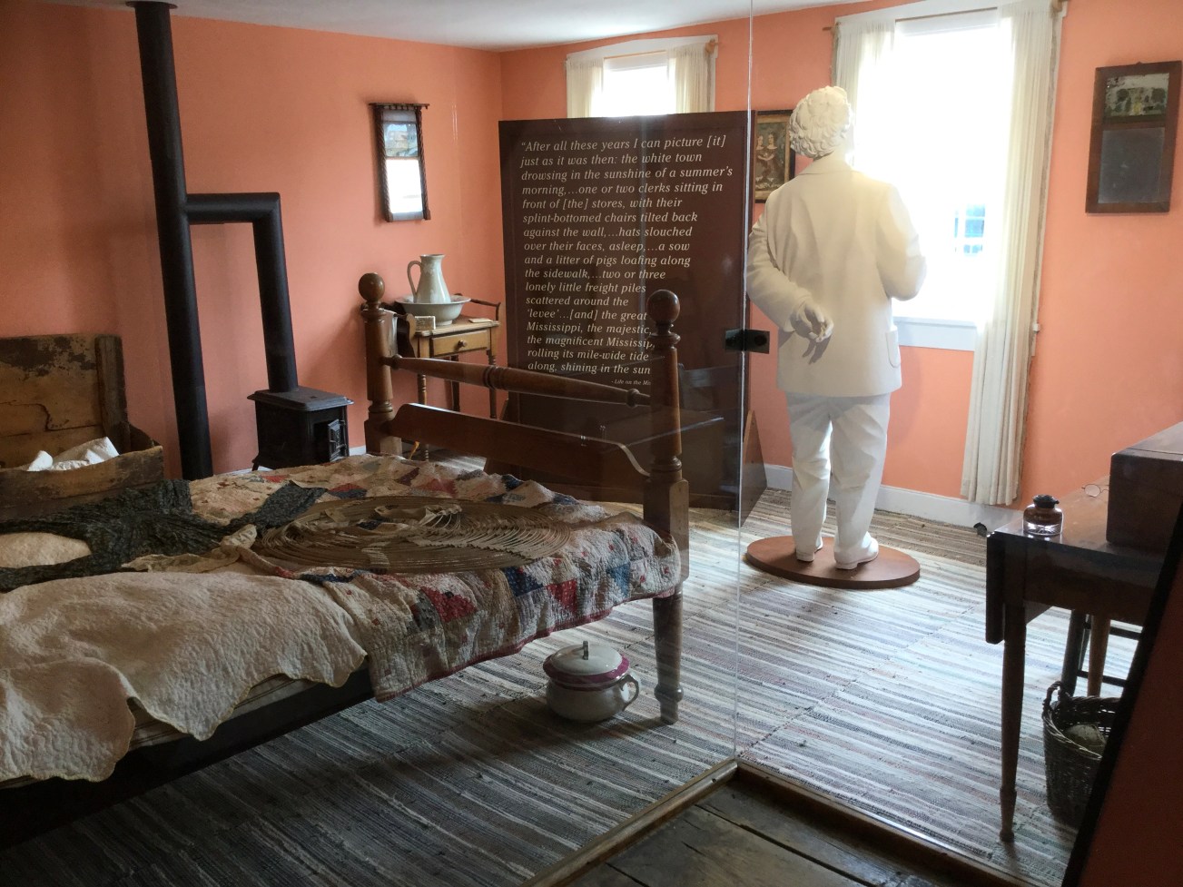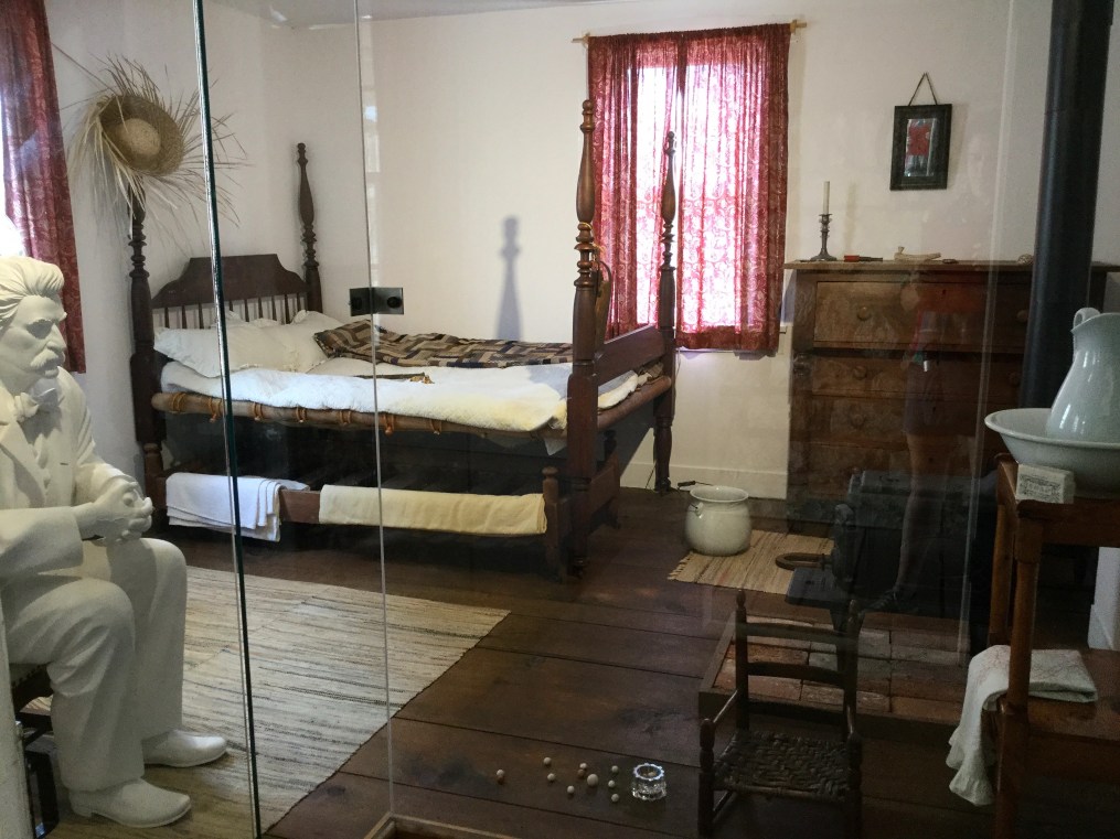 Then I cross the picket-fenced lawn by the brick-paved walkway to the Clemens family home. Unlike the ‘Huck Finn’ house, this is the original building, thoroughly restored. However, I notice, it’s missing the window shutters that it had when Twain returned to Hannibal to visit his old family home in 1902 (see above). Perhaps the shutters were added after he lived here as a child. The rooms are furnished and decorated with period-correct furniture, textiles, clothing, and other objects. Each room also features a life-size sculpture of Twain as he appeared during his later years with his trademark bushy mustache and casual white suit with bow tie. The sculptures portray Twain in attitudes of reminiscing: sitting with his hands folded while gazing into space in one room, standing with one hand behind his back while gazing out of the window in another. Twain’s novels are heavily autobiographical, his characters based on members of his family, his friends, neighbors, employers, and teachers, mostly from Hannibal. This is especially true of Tom Sawyer and Huck Finn. I notice that the historical signs outside of the buildings included in this tour, which date to the 1930’s, present Twain’s characters as if they took part in the real-life history of the place. Here in Hannibal, as in Twain’s novels, life and artifice are presented together with no clear indication of which is fact, which is fiction.