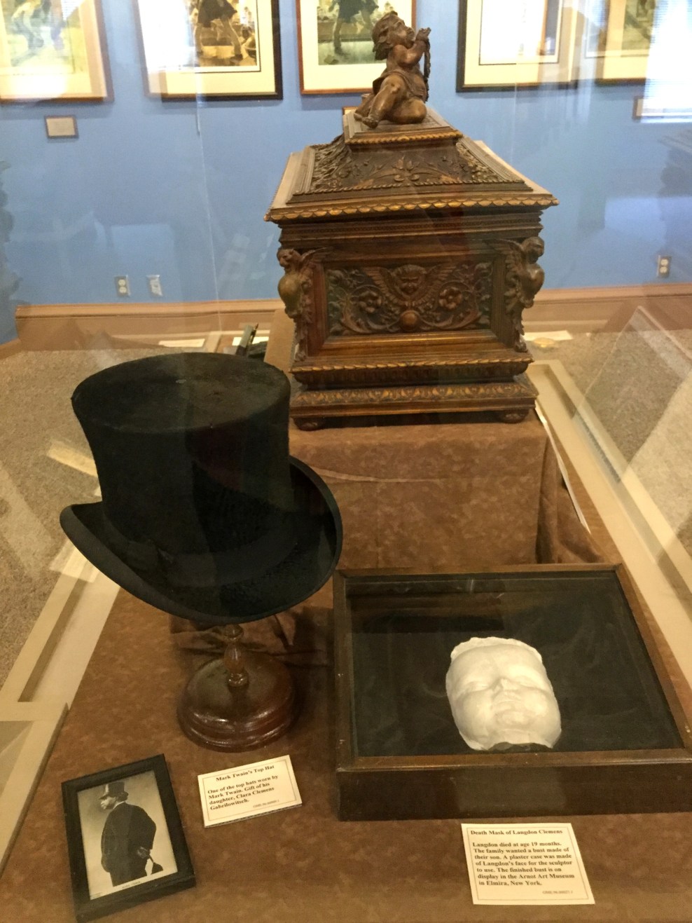 Besides the cabin, I find a wealth of artifacts from the life of Mark Twain with his wife and children. The artifacts together with the exhibits, the photographs and informational placards, tell of a life of harmony and plenty followed by sorrow and financial hardship. By the late 1860’s, Twain was making a decent living as a newspaper editor and in 1870, he married progressive, wealthy Olivia Langdon. Together, they established a lavish home in Hartford, Connecticut. It was designed by Edward Tuckerman Potter, ornately decorated by Louis Comfort Tiffany, filled with hand-carved and elaborate furnishings from all over the world, and occupied by Mark Twain and Olivia Clemens, their three daughters Susy, Clara, and Jean (their infant son Langdon died of diphtheria in 1872), and a bevy of servants. The family moved into the house with little Susy and baby Clara in the fall of 1874. While living here, Twain became a successful author and made an excellent income, he and his family enjoying the life of plenty with which they surrounded themselves. However, Twain’s enthusiasm for innovative scientific gadgets and hunger for more wealth led him to make a series of very costly and very unsuccessful financial investments, in which the family lost nearly all their money. To pay off their substantial debts and support the family, the Clemenses were forced to close down the Hartford home and move to Europe, where living expenses were generally much lower. There, Twain restored the family finances by a grueling series of speaking tours. Sadly, however, Susy contracted meningitis while she and Jean stayed behind with family in Elmira, New York. When learning of Susy’s illness, Olivia and Clara hurried back the United States to join her. However, they didn’t make it back in time. On August 18, 1896, Susy died at the Hartford home she so loved and missed. Thirteen years later, Jean also died, aged only 29, during an epileptic seizure.