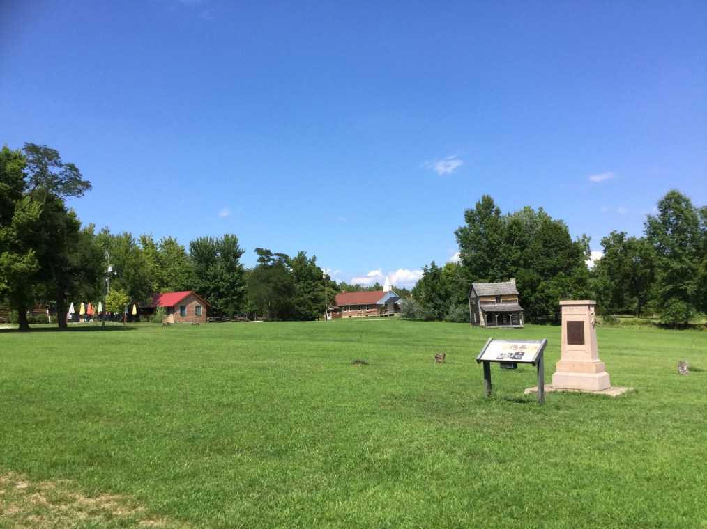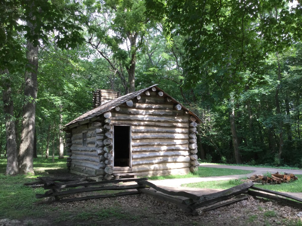 From the Michael J. Howlett building in downtown Springfield (part of which stands on the site of the Ninian Edwards house where Abraham and Mary Todd Lincoln were married and where Mary died), I head northwest on highway 97 to New Salem Historic Park. This is the site of New Salem, the small frontier commercial village which played no small role in Lincoln’s life as a young man striking out on his own. It’s a pleasant drive through farmland with homes and farm buildings and gas stations and tiny general stores scattered here and there. In a little under half an hour, I reach a wooded area, and soon after that, take the turnout to my left to New Salem. I stop for a snack at the little cafe offering a modest selection of hot dogs, nachos, sandwiches, and other things that take the edge off but don’t suffice as a meal. The park’s visitor center buildings are all closed because the air conditioning system isn’t working. I don’t blame them at all for not opening up: it feels very much like a summer day in the Midwest, hot and humid, and I imagine a full day indoors would get stuffy and miserable. But the park itself is open to roam, so I do.