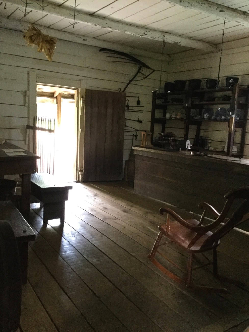I return to the main road and straight ahead of me, across the street, I find a large milled limber structure with a nice shady porch. This is the second location of Berry and Lincoln’s general store.