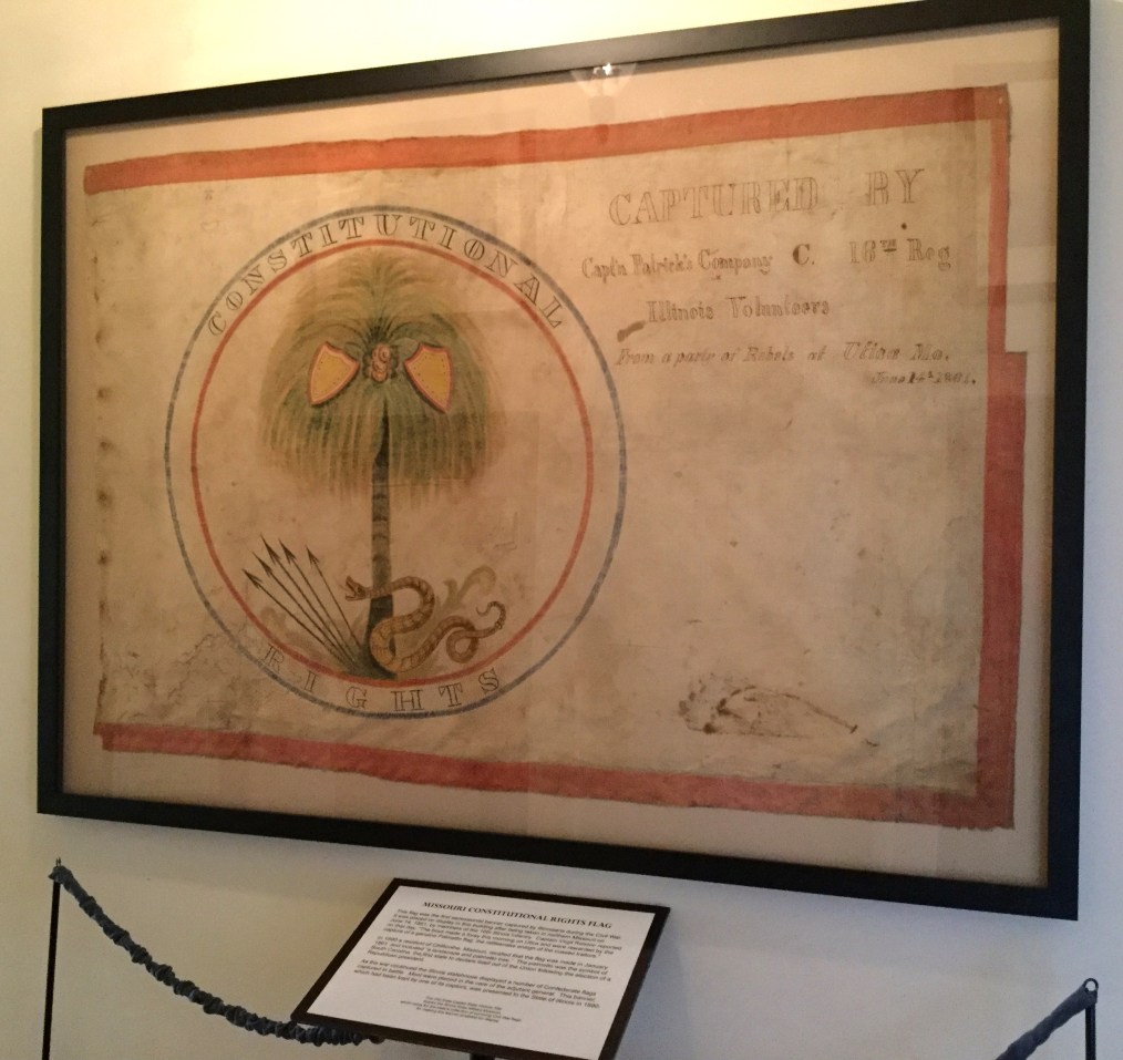 Missouri Constitutional Rights Flag captured by Union soldiers on June 14th, 1861, Old State Capitol Building, Springfield, Illinois. The claim that the Southern states seceded primarily over states’ rights issues is an oft-repeated one, and I think a troubling one for two reasons. For one, it’s part of a long tradition of trying to sidestep or minimize the problems of race-based slavery and the resulting intransigent racism that has plagued our country since its formative years, often on the part of people who don’t want to support laws that promote racial equality. For another, this states’ rights claim was as disingenuous then as it is now: the Southern states seceded not because the federal government was trying to stop slavery in their states. There was, as yet, no concerted attempt to do so. They were incensed that the federal government, in their view, was not doing enough to enforce the legal right to own slaves in free states: by forcing local governments and private individuals, against their own philosophical and religious convictions, to return escaped slaves; to allow slaveowners to retain their rights to own slaves when they traveled and even moved to free states; and to extend the rights to own slaves to new territories.