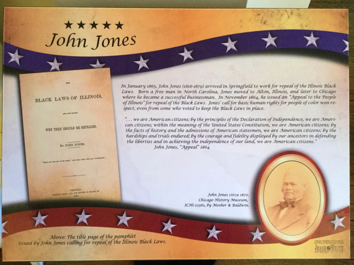 When I visited Springfield, Illinois last summer, I found a very interesting plaque at the Old State House downtown. It told the story of John Jones and his activism against Illinois’s Black Laws, a set of legal codes that pertained only to black people, and, as you likely and immediately supposed,  were terribly oppressive. Such laws have a long history in the United States and as long as they’ve been around, lovers of justice have been around to fight them. John Jones was one such person.