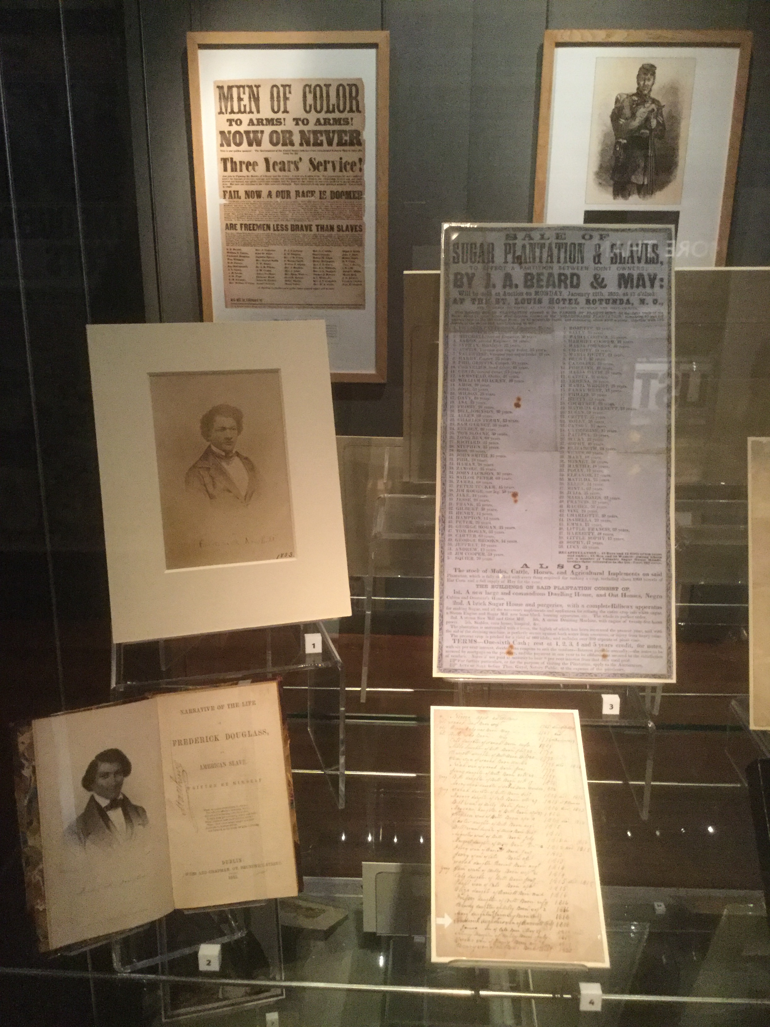 The Strike for Freedom exhibit centers around Douglass family artifacts (mostly original with occasional facsimiles) from the Walter O. Evans collection. Dr. Evans and his wife Linda are major collectors of African-American art, but Dr. Evans has also gathered a massive collection of African-American documents, photos, and other artifacts throughout the course of his life. The exhibit also includes at least one item from the NLS’ own collection, and images from the Maryland State Archives, the Historical Society of Pennsylvania, the Library of Congress, the Central Library of Rochester & Monroe County in New York, and the National Park Service’s Frederick Douglass National Historic Site in Washington, D.C.
