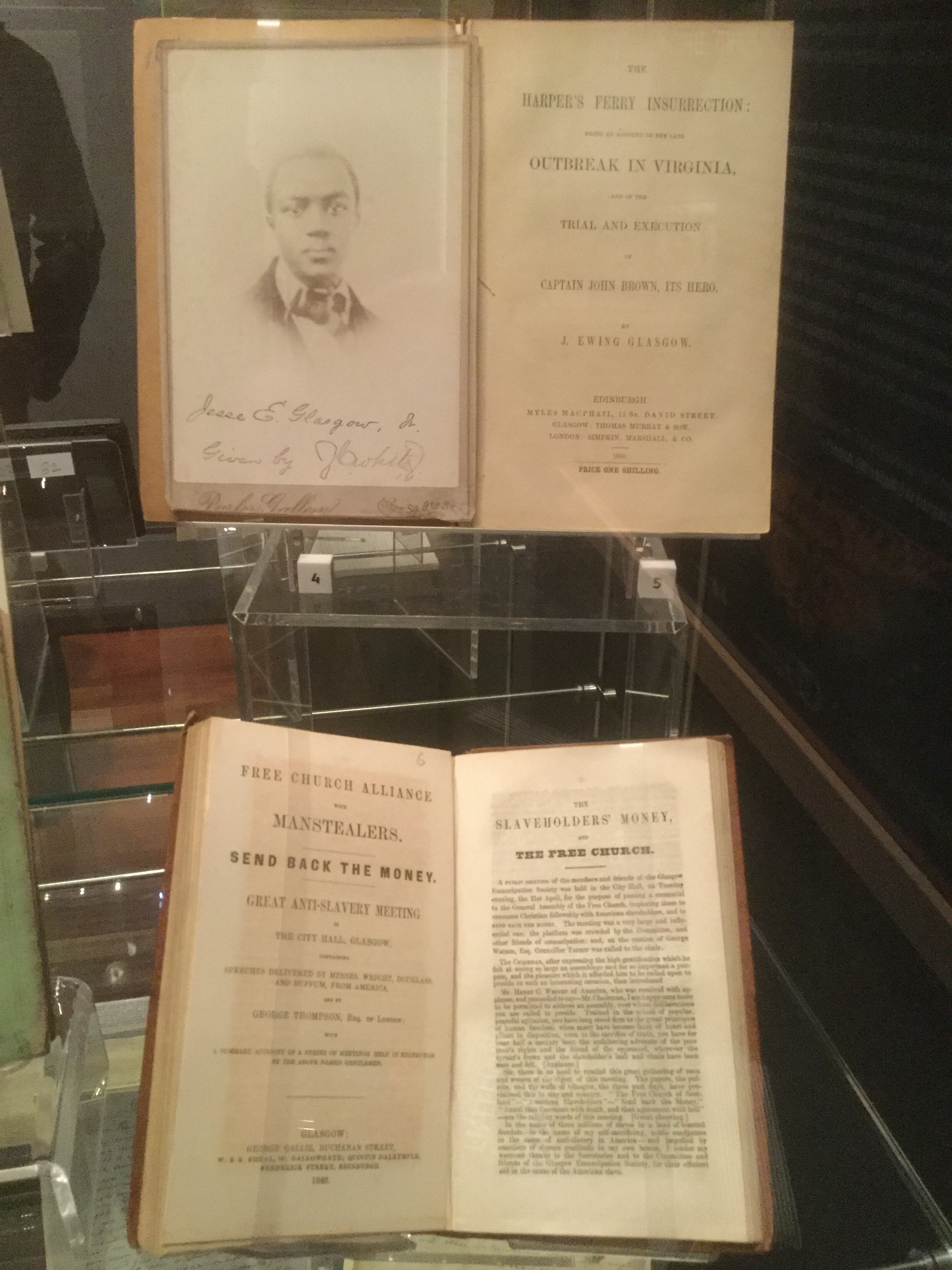 Jesse Glasgow’s book on Harper’s Ferry and John Brown and a ‘Send Back the Money!’ anti-slavery meeting pamphlet at the Strike for Freedom exhibit at the NLS, 2018. Glasgow was a classics student at the University of Edinburgh and unfortunately, died young in 1860, at only age 23, having already become a published author and an award-winning scholar.