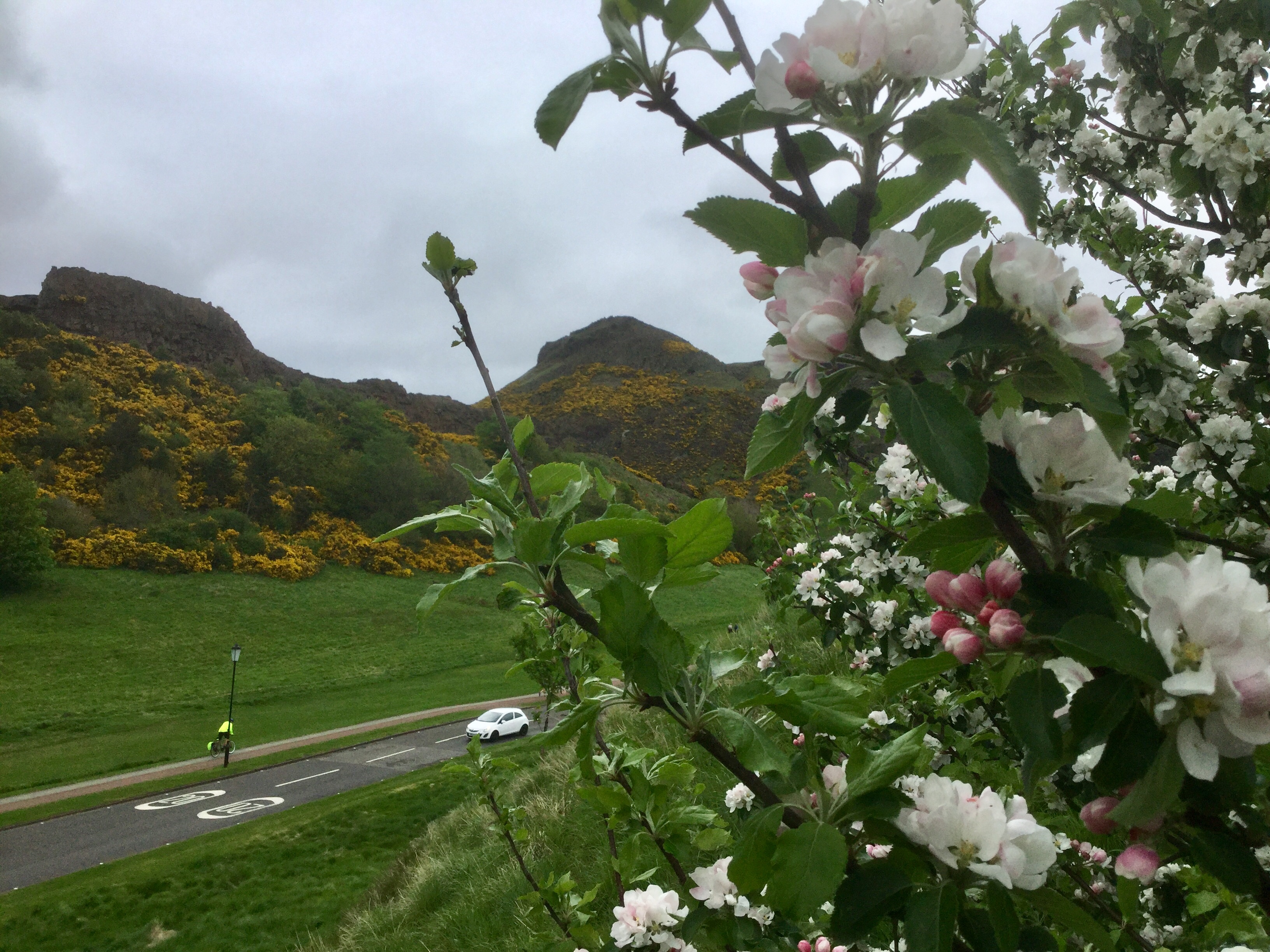 Holyrood Park in spring, viewing Salisbury Crags and Arthur’s Seat thru a flowering shrub, Edinburgh, Scotland