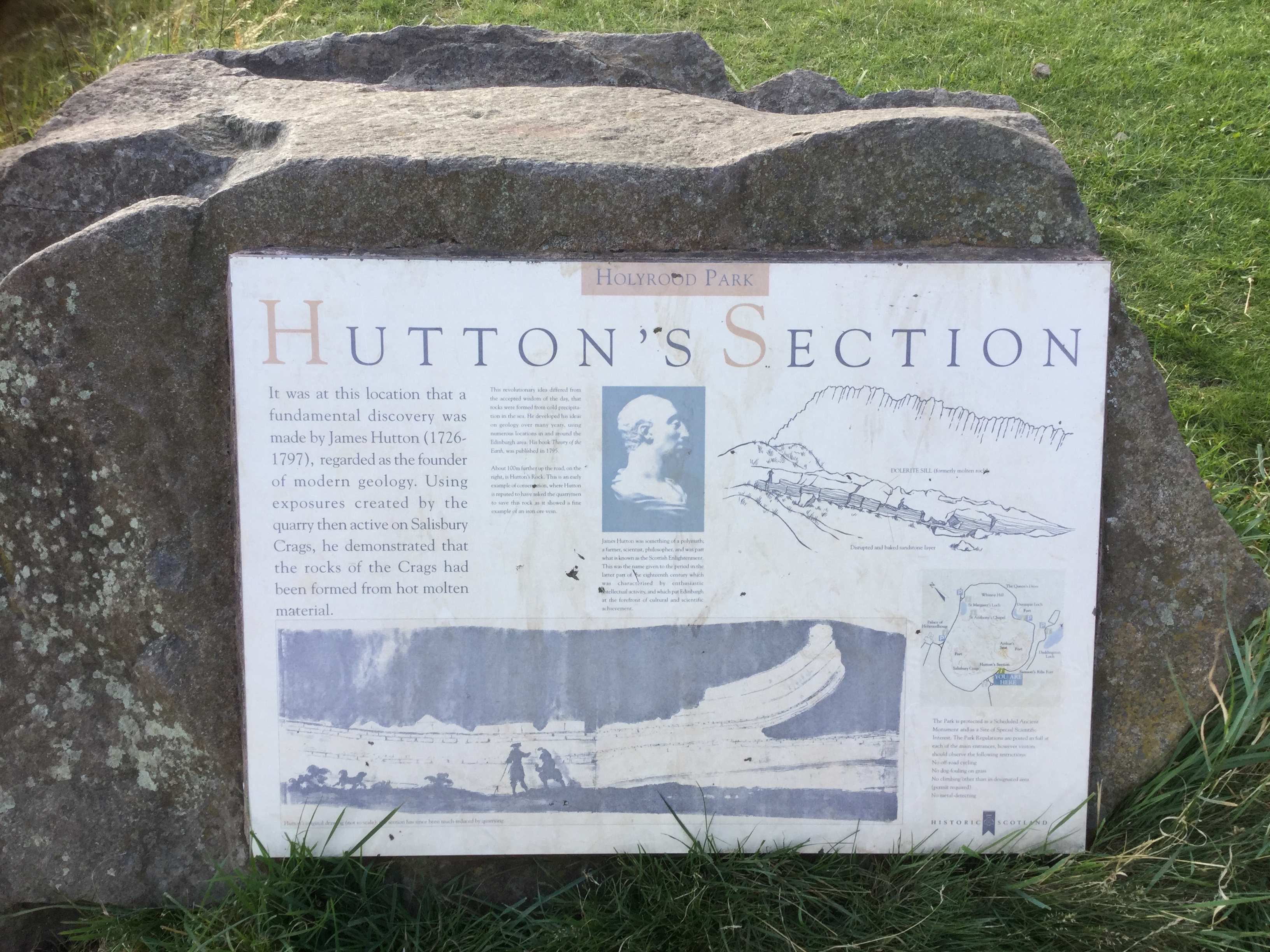 Scroll down to see my photos of Hutton’s Section in Holyrood Park and its explanatory sign, and learn more about the great James Hutton through the links below: