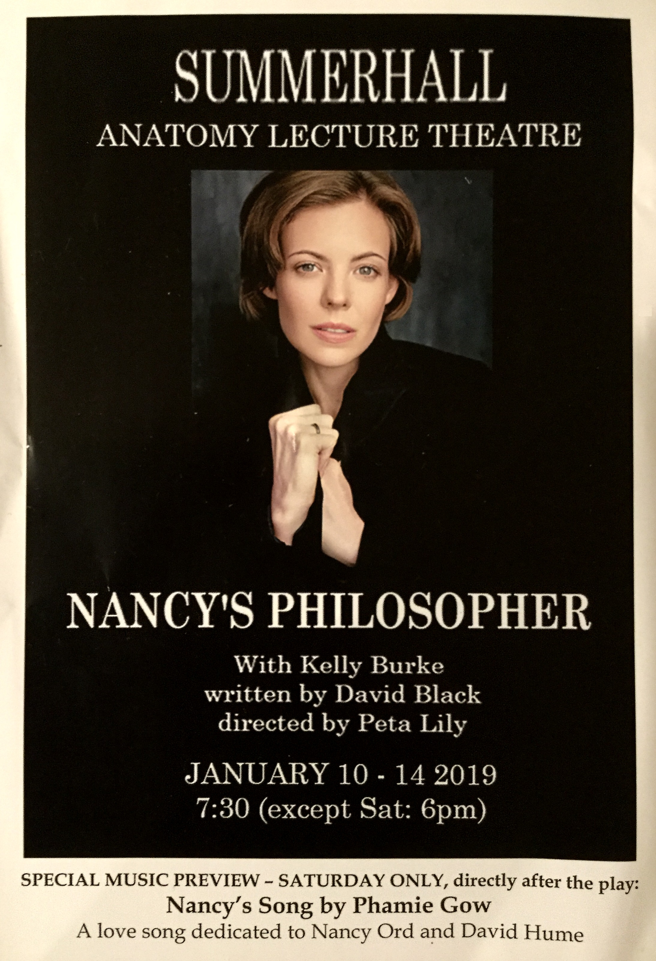 Last night, I attended the one-woman play Nancy’s Philosopher starring the lovely and expressive Kelly Burke, written by David Black.