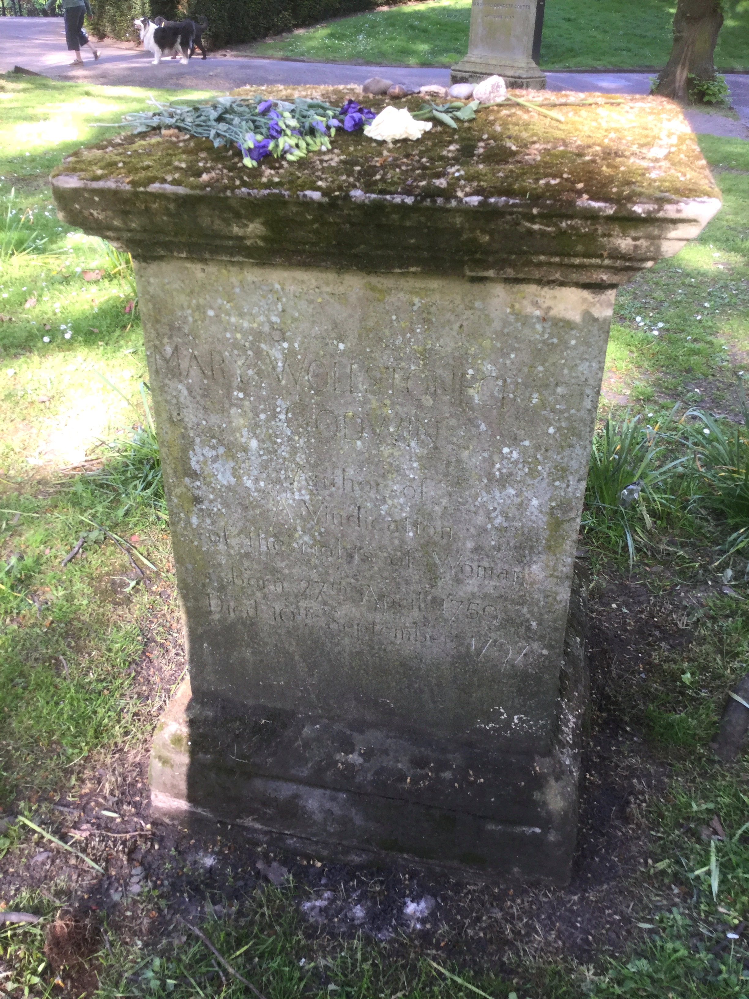 St. Pancras was a lovely place to be on such a lovely day; the leaves and grass were lush and green and lavishly sprinkled with flowers. I was happy to see that Wollstonecraft’s memory was still being honored, with flowers and other little tributes placed on the top. I suspect that it was Godwin who chose this elegant coffin and specially for Wollstonecraft, since she lived so independently of her family and was the first to be buried here. Its clean lines emphasize the carved text on the front: ‘Mary Wollstonecraft Godwin, Author of Vindication of the rights of Woman, Born 27th April 1759, Died 10th September 1797.’ This inscription also reflects Godwin’s intellectual love of Wollstonecraft. In the title of her biography, Memoirs of the Author of A Vindication of the Rights of Woman, he repeated this emphasis on her immortal ideas contained in her most memorable work.