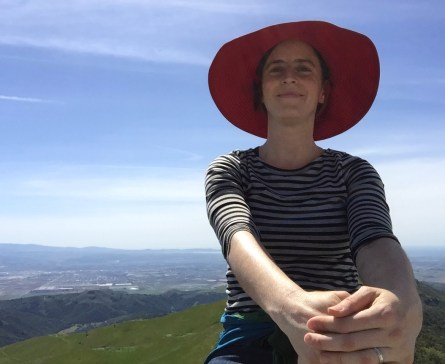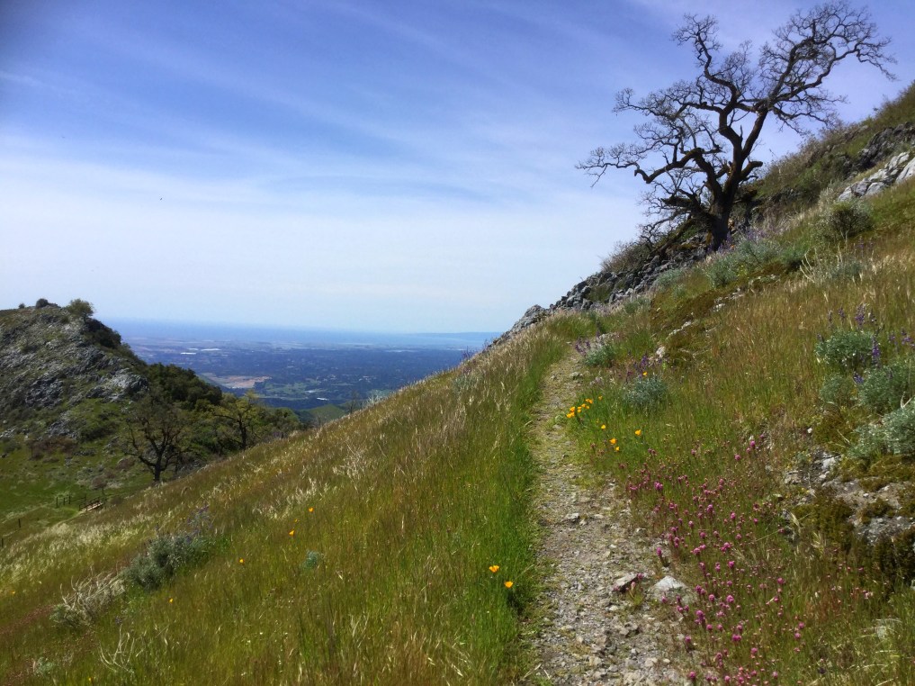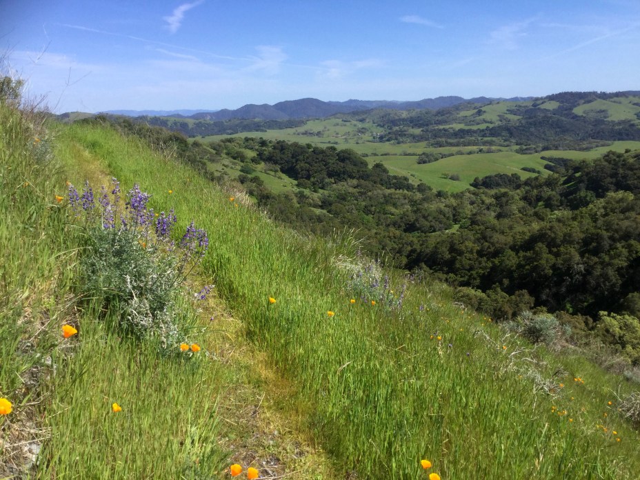 At the foot of the Peak Trail, I turn right onto Carmen’s Trail, which zigzags thinly through slopes thickly covered with softest greenery and more thistles, which gently sting my ankles. It’s lovely and cooler here in the shade of taller oaks, which need to reach higher for the sun in this little canyon. The narrow creek bed running along its bottom is already dry. On the other side, the trail ascends a grassy, open hillside, the green just barely beginning its Midas’ touch transformation into the gold of summer. It’s inset with jewel-bright lupine and poppies throughout.