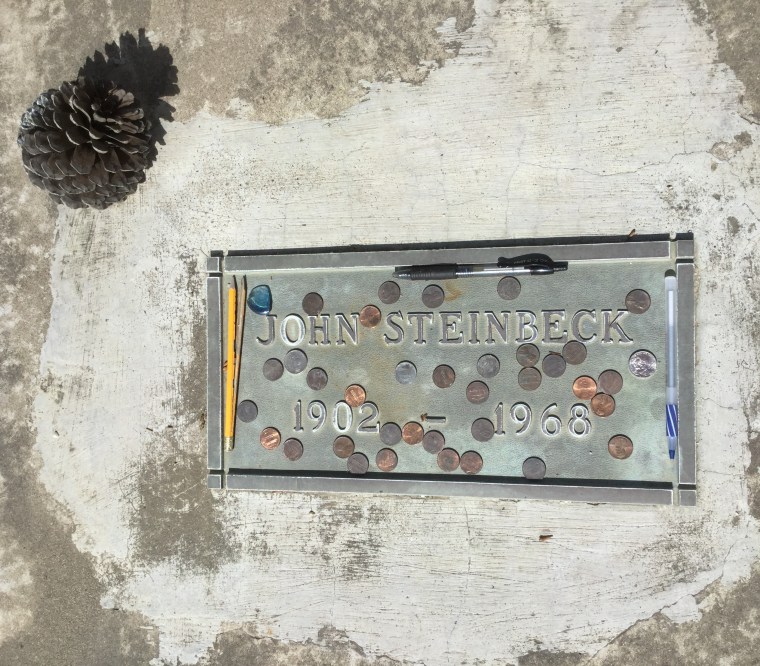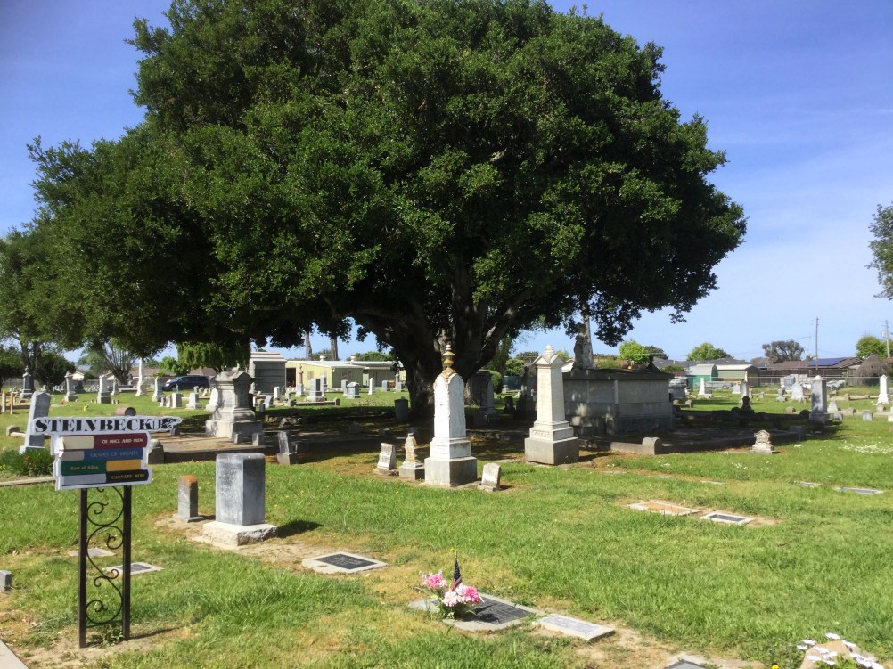 I continue an hour north to Salinas, where I visit Steinbeck’s grave in the Garden of Memories at Abbott St and East Romie Ln. Here he lies surrounded by his family. His headstone is the one decorated with tributes: coins, pens, and one pine cone (artfully placed by nature or a fan, I don’t know). You may recognize some of the names from his novel East of Eden: Hamilton, the family name of his mother; John Ernst, the first and middle name of the author and his father; and Olive Hamilton, the schoolteacher daughter of Samuel Hamilton and the author’s mother. It’s pretty here today, very green, with tiny white daisies and various kinds of yellow flowers blooming everywhere.