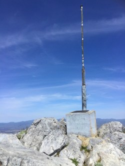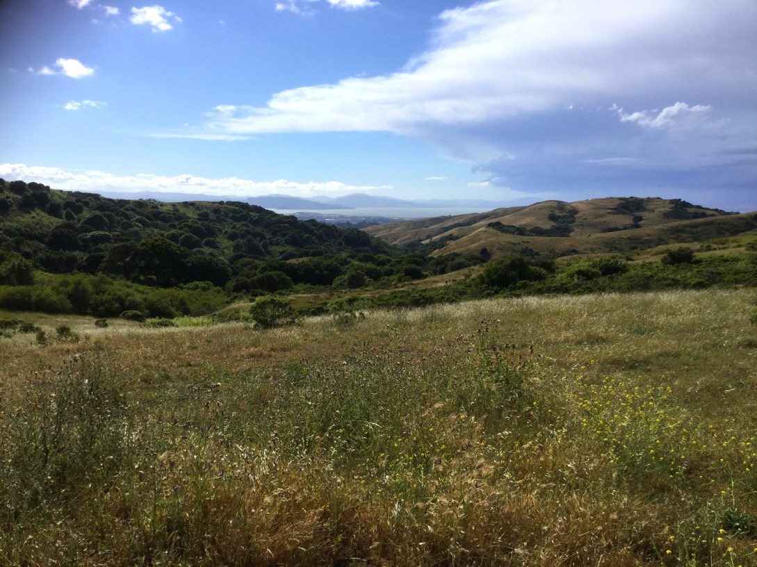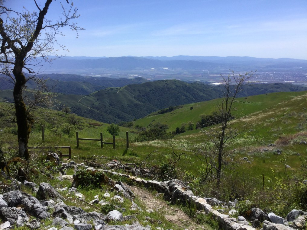 In all seriousness, though, this is a beautiful spot, conducive to much loftier thoughts and feelings. I climb to the peak, and the view is incredible. It’s even greener than it was in March, and now it’s wildflower season. The Monterey Bay spreads out ahead and a little my left, and the crop fields grow to my right. The Salinas Valley region is one of the most productive agricultural areas of California. The sight of Fremont’s flagpole here at the top has been marked by another, much sturdier one, and a brass plaque set in concrete, which tells the tale even more heroicly. I chuckle again as my reflective mood is broken.