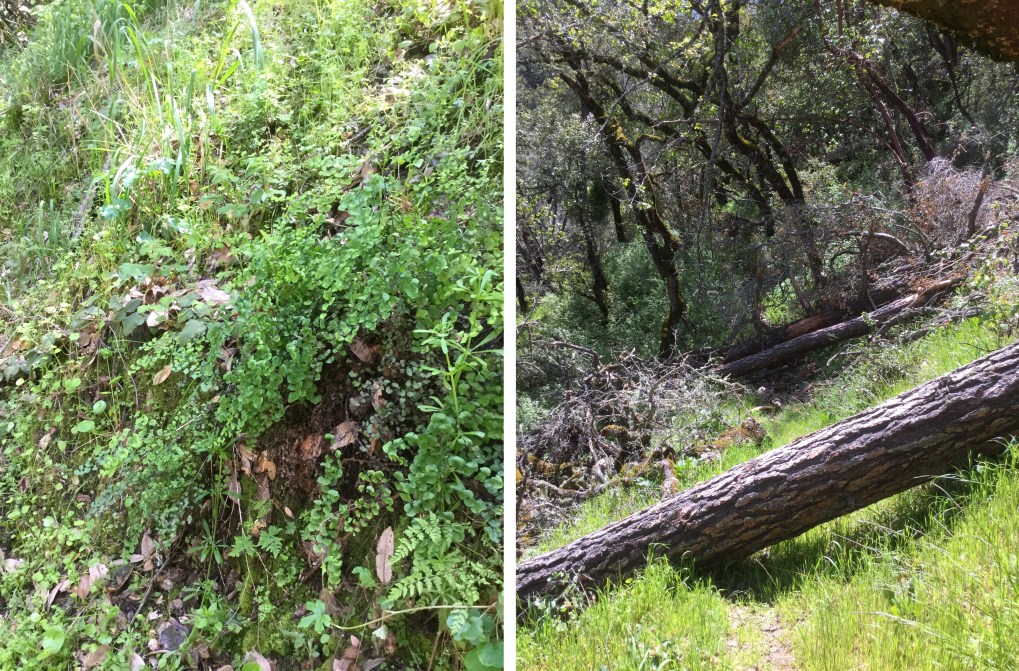 Left: Maidenhair, miner’s lettuce, spiny wood fern, and grasses. Right: Fallen logs. On Cold Springs Trail, Fremont Peak S.P., CA