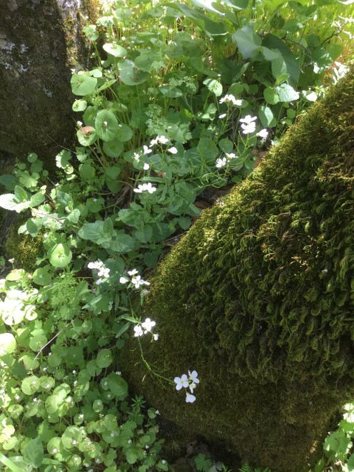 Milk maids and miner’s lettuce in bloom around a mossy trunk, Fremont State Park, CA