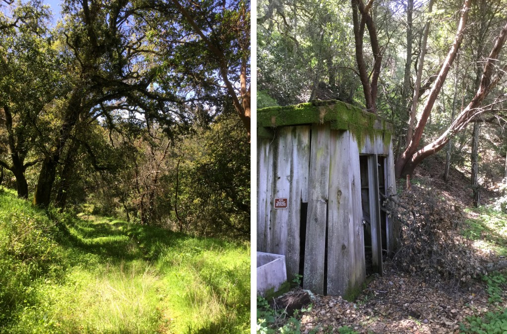 On Cold Springs Trail, Fremont Peak State Park, CA. Left, the windy and narrow under the mossy oaks. Right, a small abandoned shack which on first glance appears to be a two-room outhouse but which contains no signs of plumbing or waste pits. The sign above the trough warns that the water no longer piped here is unsafe for drinking