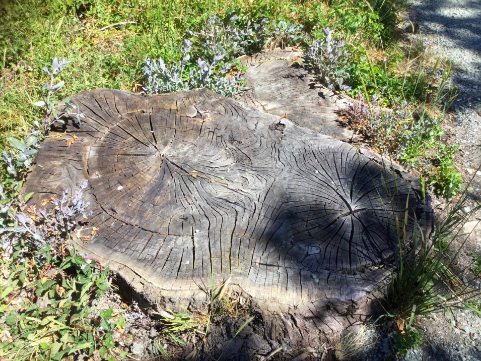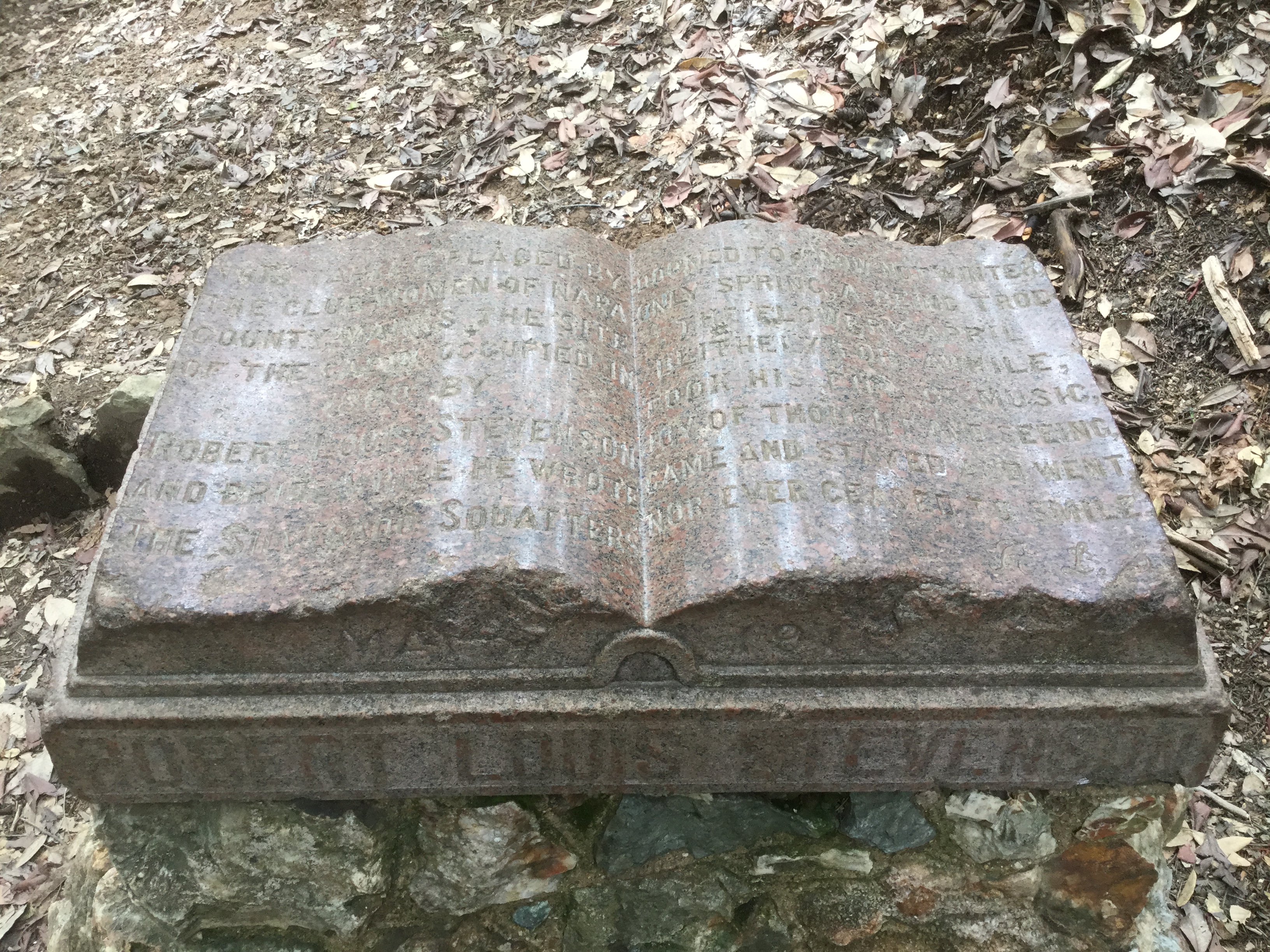I arrive at the parking lot near Oak Point Campground where the Peak Trail begins, which I ascended with the John Steinbeck Odyssey Tour group in March. There’s a large sign framed in stone which tells the story of Captain John Charles Fremont’s run-in with Prefect Manuel Castro and General Jose Castro in 1846. It tells it as if it’s a heroic tale on Fremont’s part, but it reads to me like an act of arrogance and a provocation to war, waltzing into another’s country with an army and without a by-your-leave then planting your nation’s flag in their soil. His flagpole blew down, however, and the superstitious general hightailed it out of there with his soldiers before any fighting started. The roof of this monument has likewise fallen and a shirtless beefcake is reflected in the sign as I take a picture. The circumstances of this moment make me chuckle.