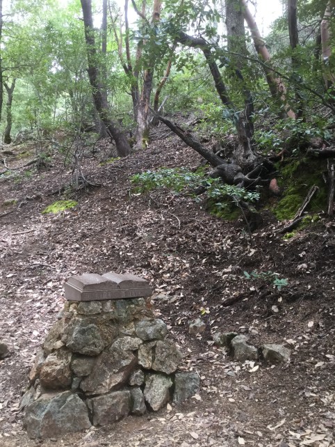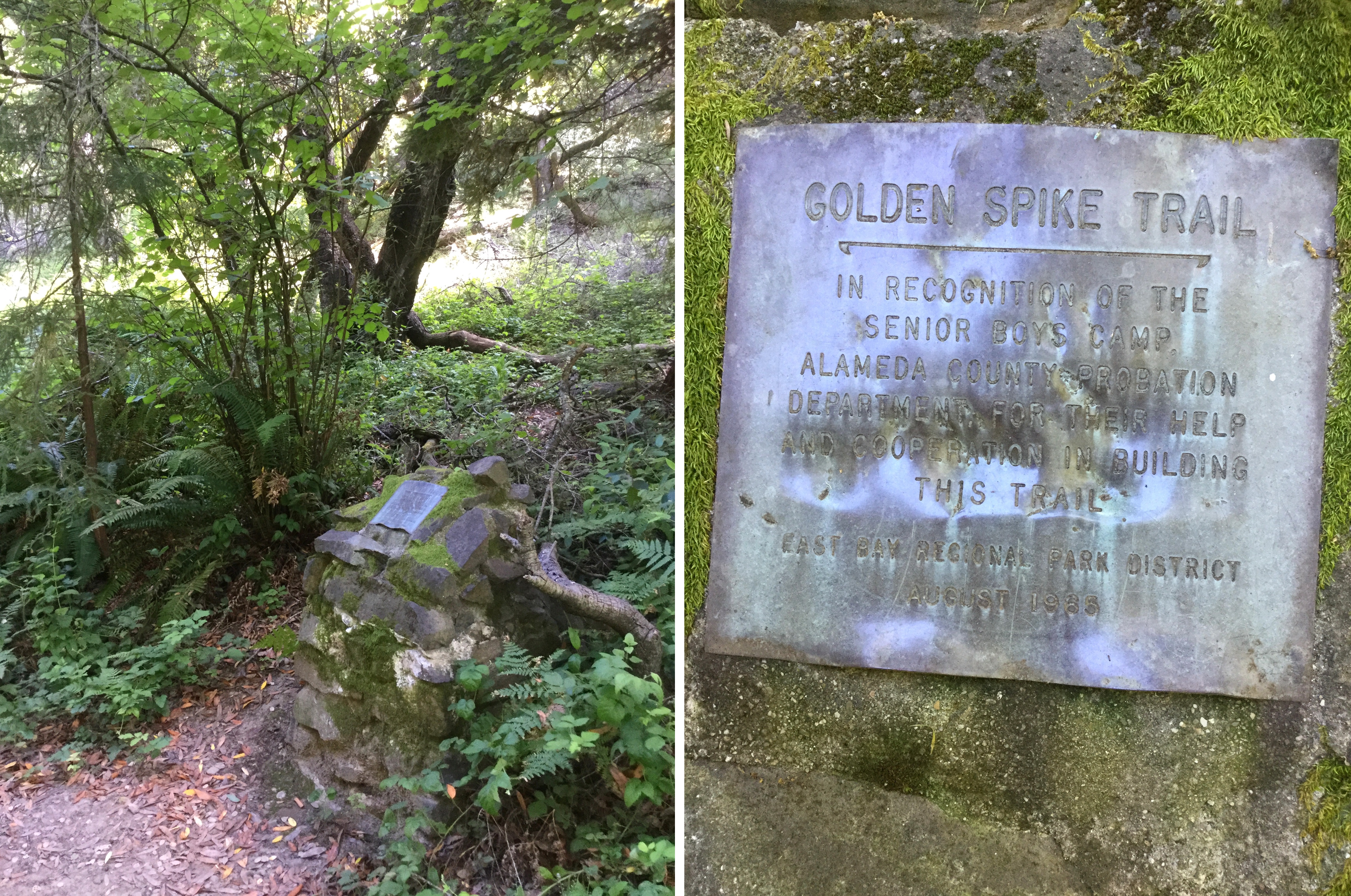 Commemorative marker on Golden Spike Trail running north along Grass Valley Creek, Redwood Regional Park