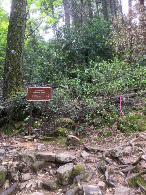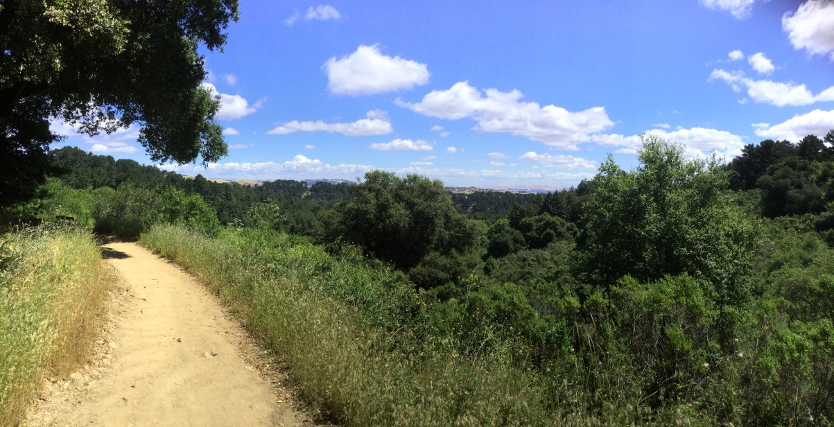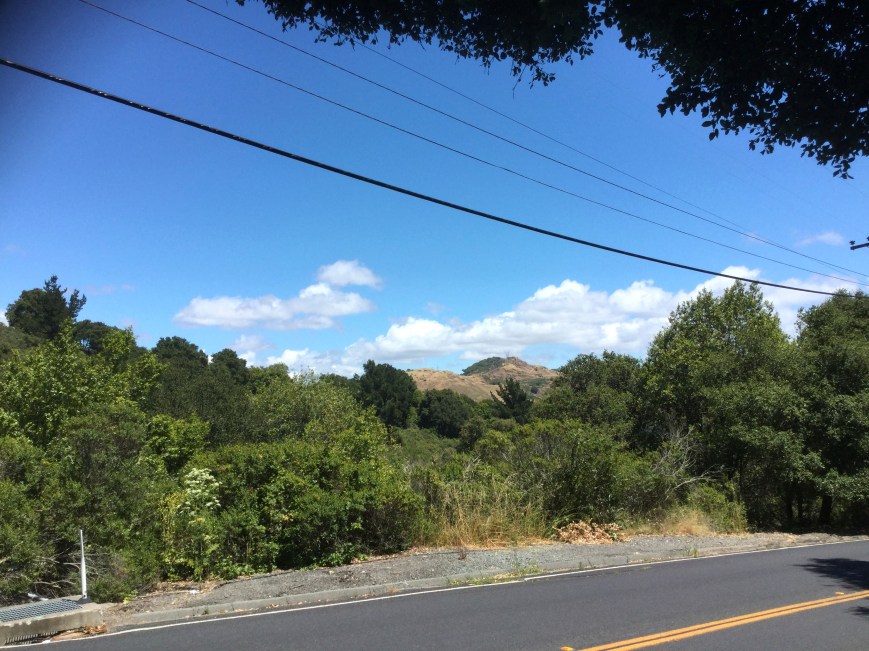 Suddenly, the path changes. It’s broader and sandier, and the mossy oaks abruptly give way to manzanita, toyon, and coyote brush. Now I can look up and out at the view because the growth is lower and sparser here, and because the poison oak clearly doesn’t like this dry and sunny side of the hill. Soon after the change, I come to a clearing where a signpost marks the beginning of Valley View Trail where Cold Springs ends at a fire road crossing. There are two weathered picnic benches to my left and a beautiful stand of purple lupine to my right. I veer left on the fire road, then right to continue on to Valley View Trail. The oaks have reappeared, interior live, scrub, and poison. I pick my way with great care again, but the trail is so overgrown and the fallen branches so tangled with it that I’m not sure if I successfully avoid all danger. I’ll be sure to take a hot shower with a scrub brush and plenty of soap when I get home.